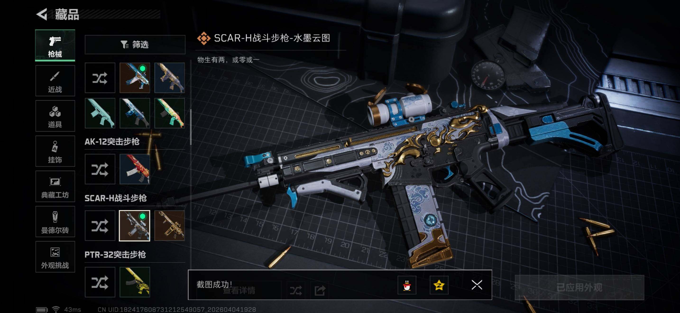 【传说外观】:QBZ95-1突击步枪-凌霄戍卫,SG552突击步枪-点翠,SCAR-H战斗步枪-水墨云图,SCAR-H战斗步枪-启航,KC17突击步枪-点翠,M14射手步枪-缄花,SR-25射手步枪-缄花,PSG-1射手步枪-点翠,.357左轮-缄花