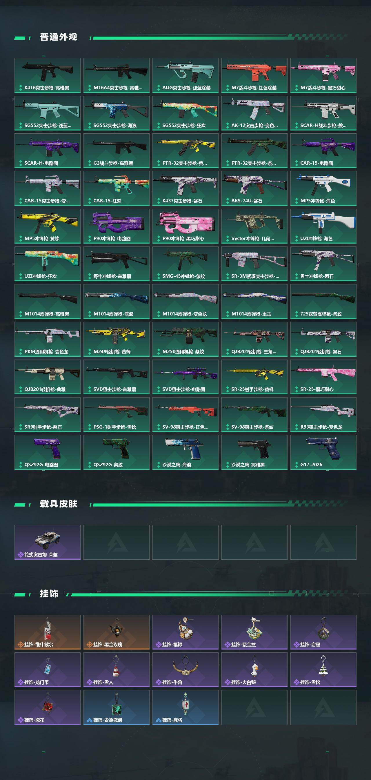 【传说外观】:M4A1突击步枪-阿米娅,ASh-12战斗步枪-鹅鸭杀,SG552突击步枪-运动员,SCAR-H战斗步枪-启航,G3战斗步枪-骑士,CAR-15突击步枪-阿米娅,QCQ171冲锋枪-鹅鸭杀,M250通用机枪