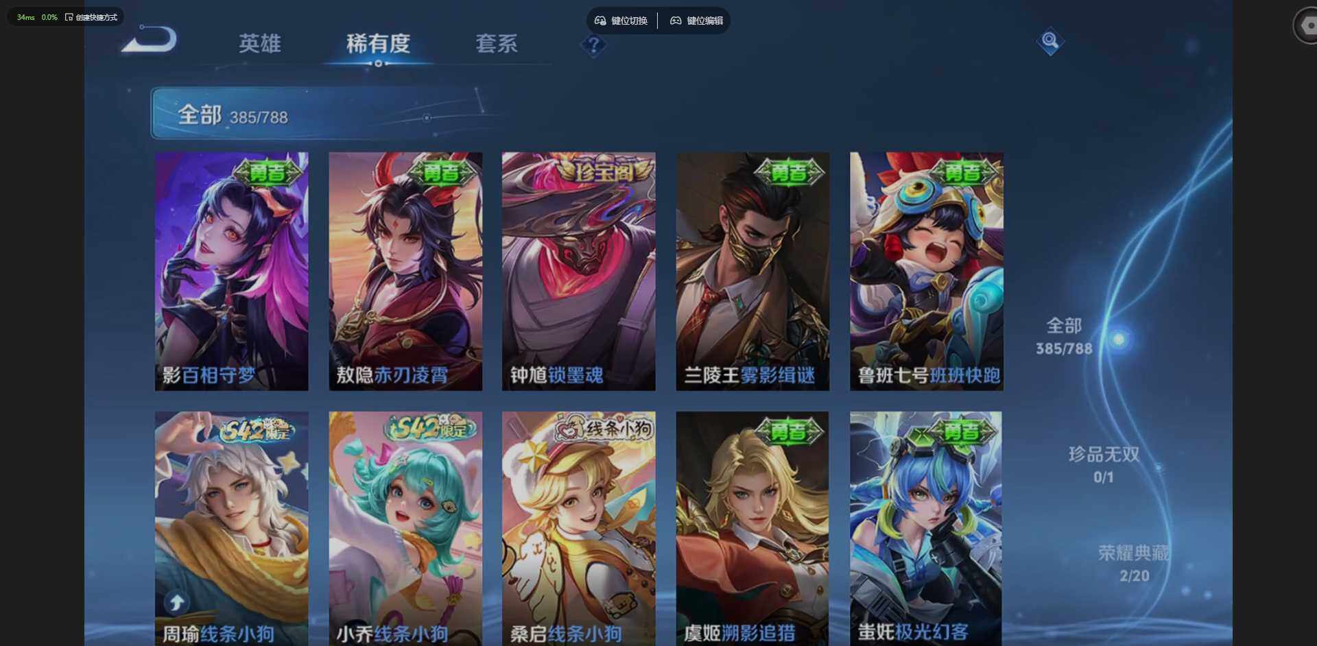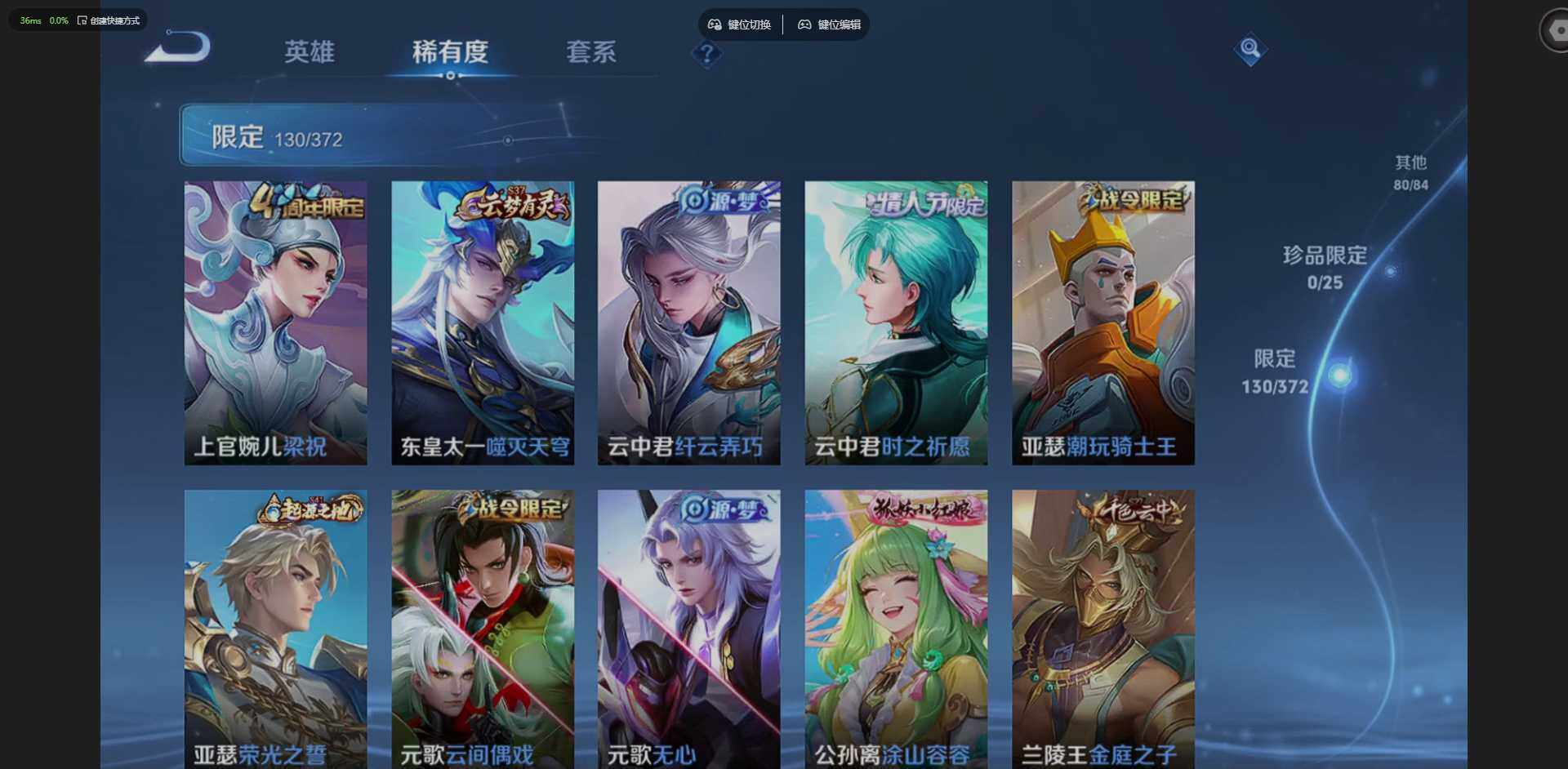 实名: 可修改 贵族等级: V8 英雄数: 128 皮肤数: 385 荣耀水晶