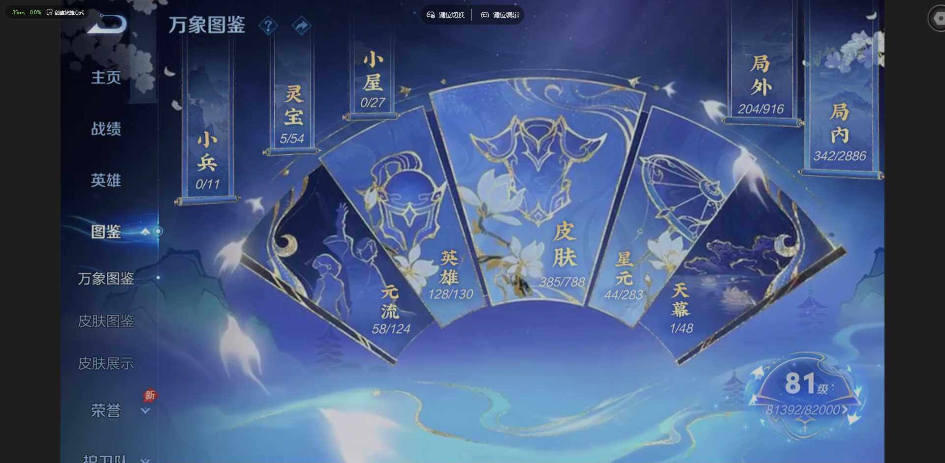 实名: 可修改 贵族等级: V8 英雄数: 128 皮肤数: 385 荣耀水晶: 全息碎影,赤影疾锋 星传说: 幽冥之眼,零号·雷霆,星际治安官 传说皮: 黄金射手座,久胜战神,地狱火,零号·赤焰,地狱之眼,乞巧织情,时之恋人-刘备,淬星耀世,超时空战士-狄仁杰,挚爱之约,挚爱花嫁,神器·狴犴令,乘龙·问璇玑,乘龙·铭钟鼎,乘龙·淬吴钩,典韦战鼓燎原,神树通天 限