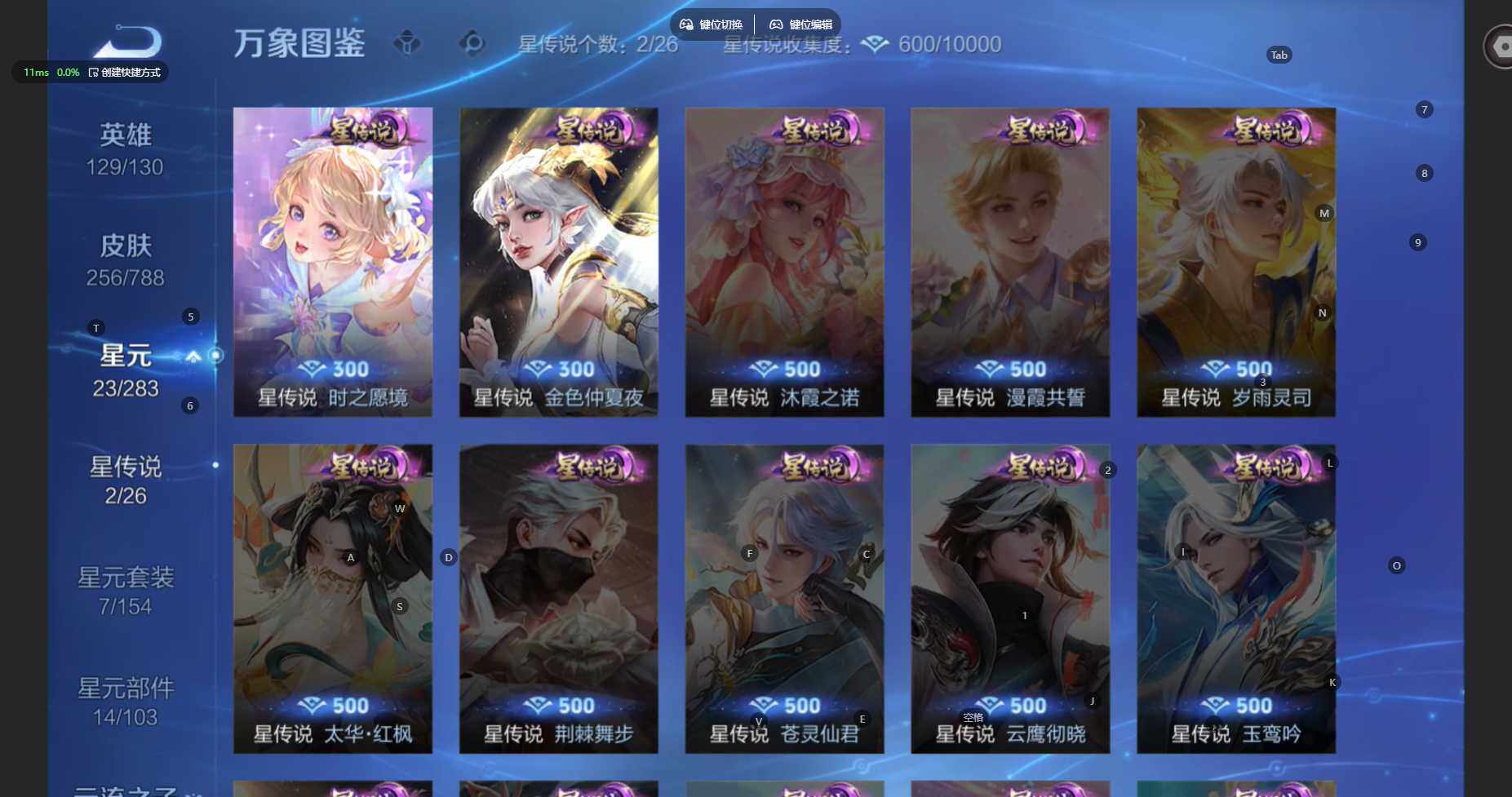 【传说皮肤】:后羿神树通天,女娲愿照千秋盛,妲己愿照众生和,虞姬愿照岁时盈,云缨幻光神枪,桑启鸣野蒿,貂蝉曦玄引,孙尚香乘龙问璇玑,孙策乘龙淬吴钩,女娲补天,孙策末日机甲,瑶时之
