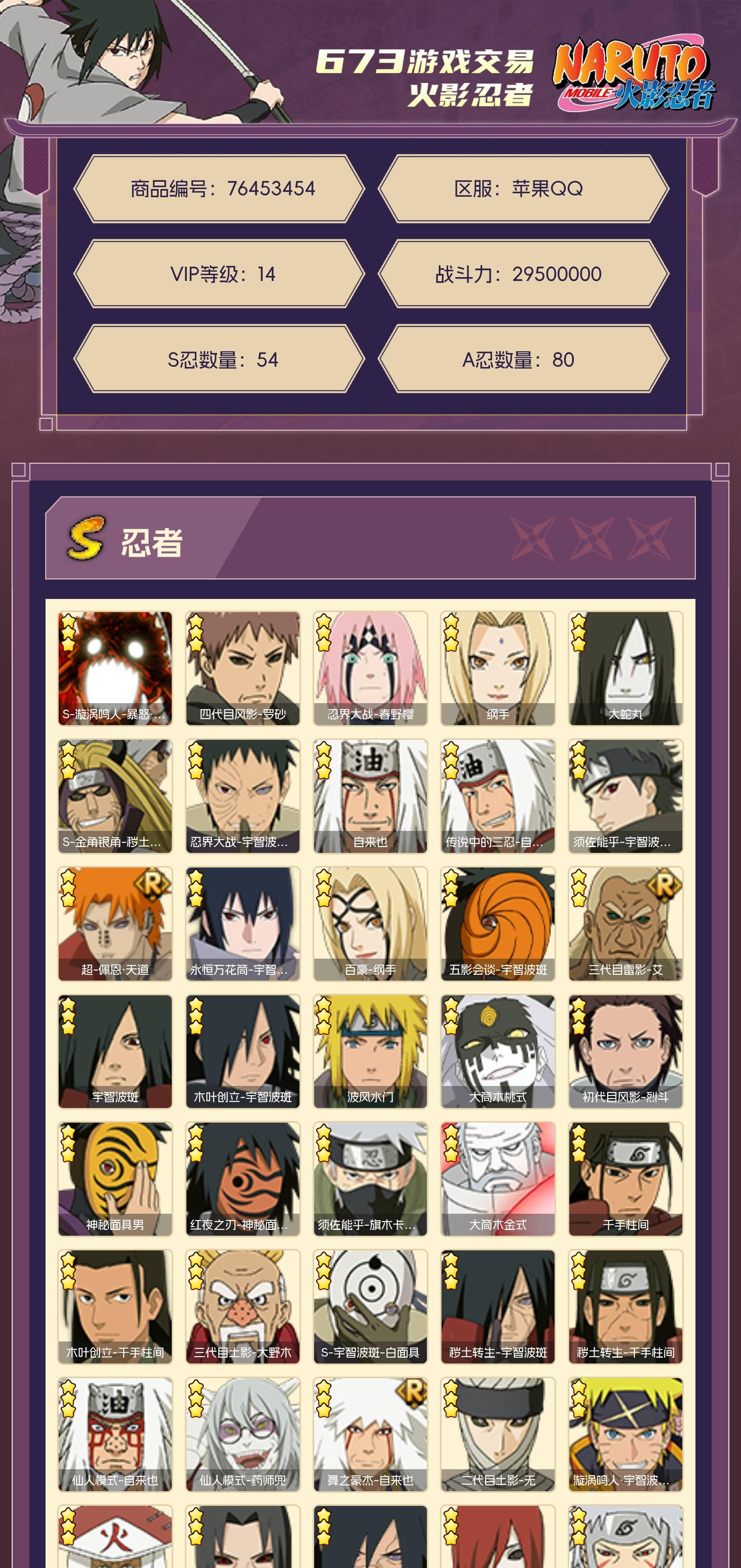 角色等级165 金币50000 战斗力29500000 S忍54 A忍80 5星S忍者4 14 段位上忍