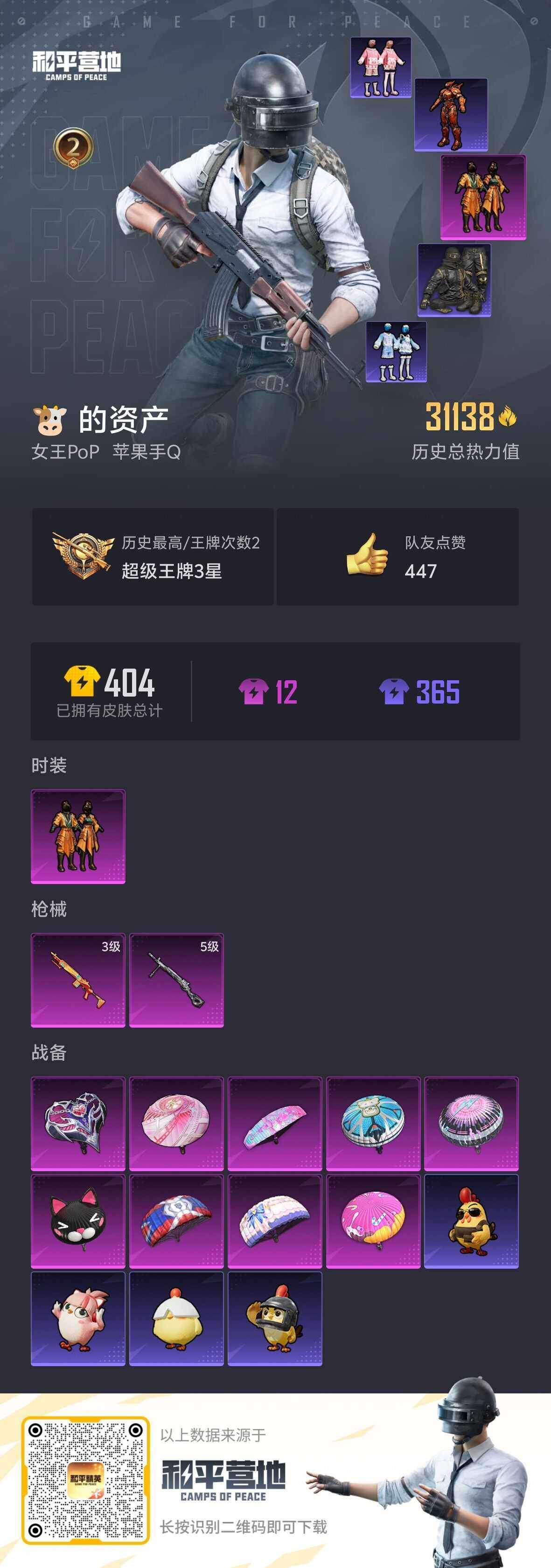 实名: 可修改 时装数: 364 枪械数: 110 战备数: 89 热门装扮: