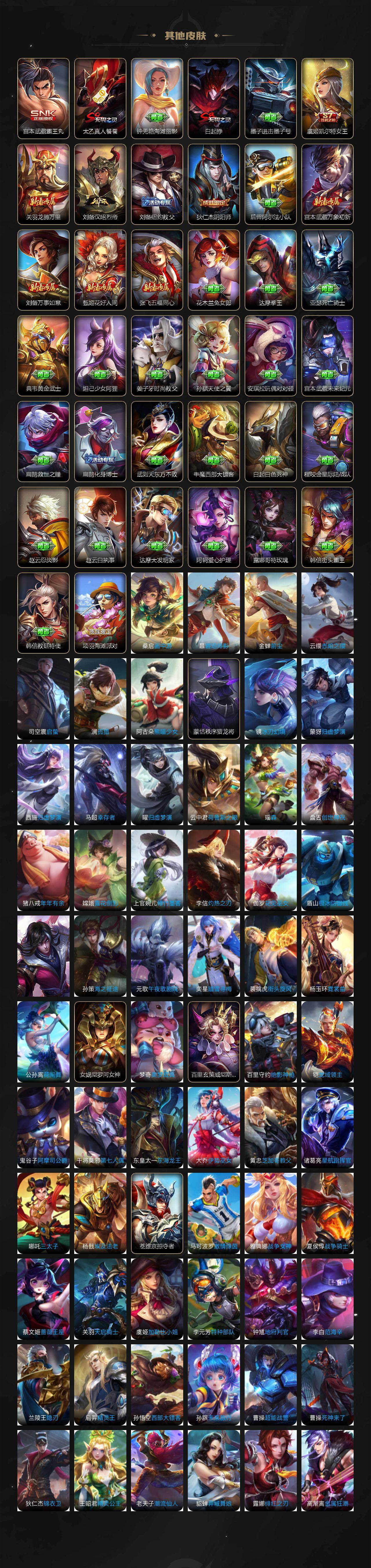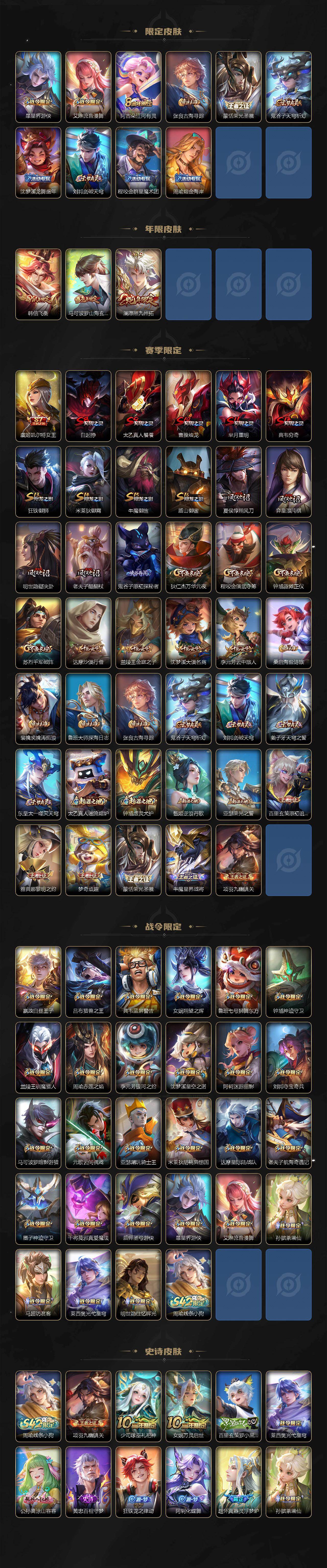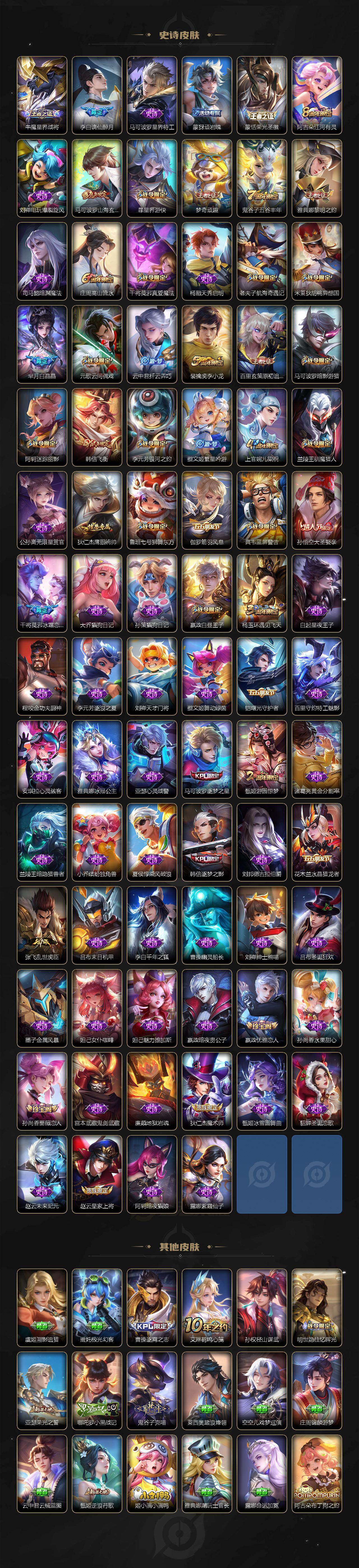 贵族等级4/荣耀典藏数量2/传说皮肤数量12/史诗皮肤数量93/皮肤数量331/英雄数量127/段位最强王者/司马懿全皮/孙权全皮/空空儿全皮/鸣剑·曳影 李白/拾光映像 瑶/神树通天 后羿/千山共赴 干将莫邪/九山相柳 司马懿/愿照·九州拓 澜/鸣野蒿 桑启/逐花归海 澜/画中仙 干将莫邪/深海之息 马可波罗/乞巧织情 王昭君/久胜战神 干将莫邪/仲夏夜之梦 貂蝉/超时空战士 狄仁杰/狰 白
