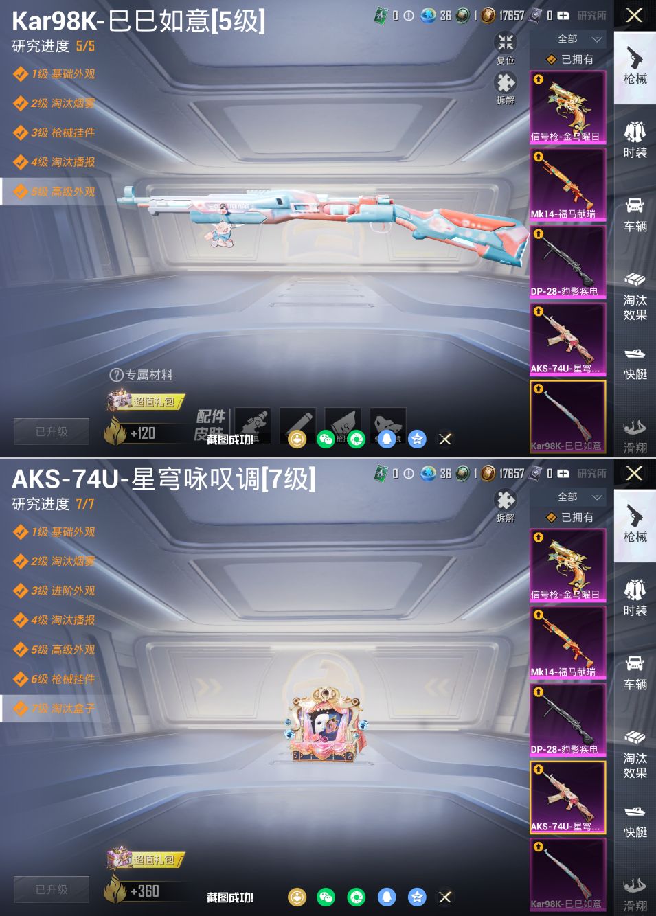 【6特效枪】Mk14-福马献瑞[5级],DP-28-豹影疾电[5级],AKS-74U-星穹咏叹调[7级],AKM-绿萝繁花[5级],Kar98K-巳巳如意[5级],信号枪-金乌曜日[3级]