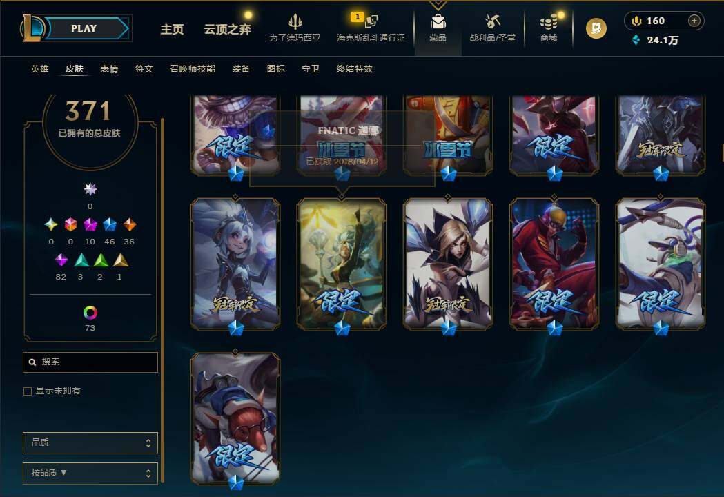 172英雄/371皮肤/10神话/46限定/8臻彩/73炫彩/