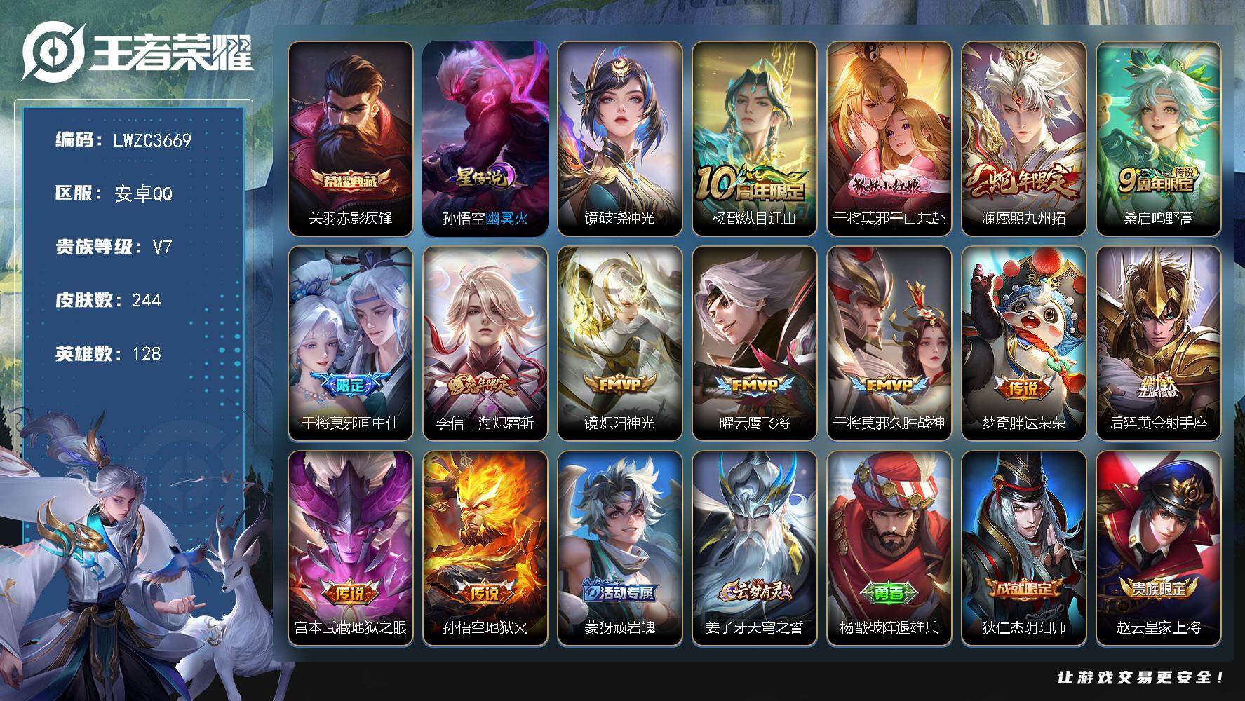 【特价急出/详情看图】安卓Q-V6-至尊星耀IV段位-128英雄-244皮肤-1典藏皮肤-2星元-13传说-60史诗【英雄全皮】:孙权全皮【荣耀典藏】:关羽赤影疾锋【传说皮肤】:杨戬纵目迁山,干将莫邪千山共赴,澜愿照九州拓,桑启鸣野蒿,干将莫邪画中仙,李信山海炽霜斩,镜炽阳神光,曜云鹰飞将,干将莫邪久胜战神,梦奇胖达荣荣,后羿黄金射手座,宫本武藏地狱之眼,孙悟空地狱火【限定皮肤】:蒙犽顽岩魄,姜子牙天穹之誓,杨戬破阵退雄兵,狄仁杰阴阳师,赵云皇家上将,高渐离死亡摇滚,钟无艳超时空战士,元歌云间偶