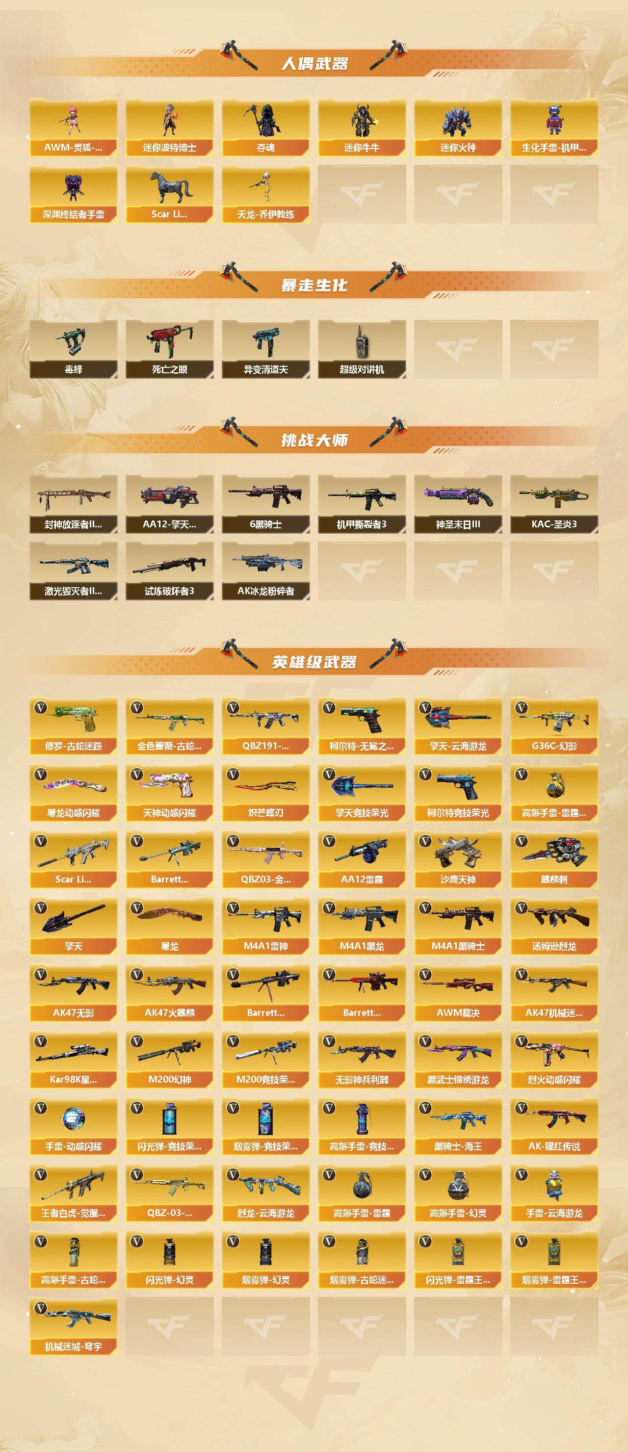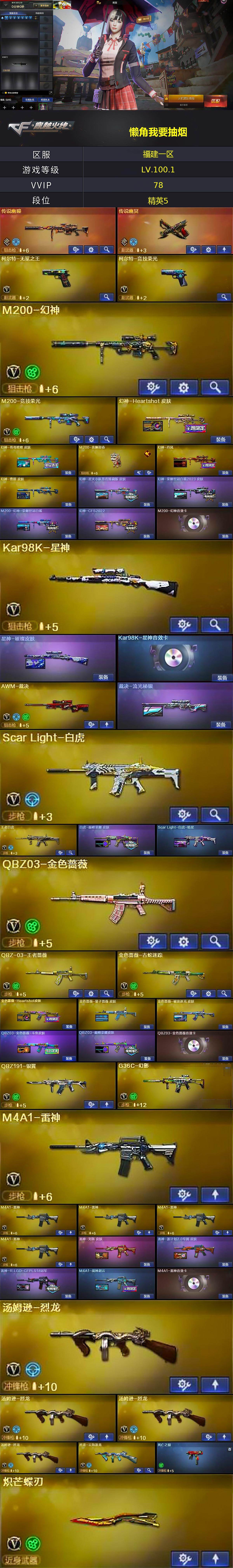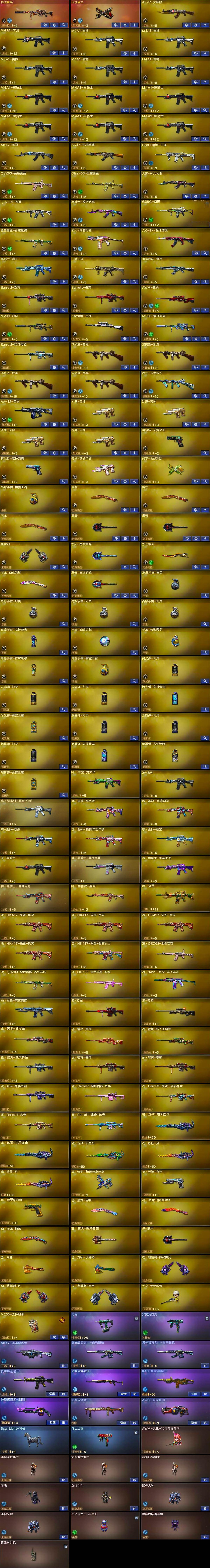 【热门武器】:传说幽瞳,传说幽冥,G36C-幻影,QBZ03-金色蔷薇,Scar Light-白虎,M200-幻神,金色蔷薇-古蛇迷踪,修罗-古蛇迷踪,M200-竞技荣光,死亡之眼,Kar98K-星神,毒蜂,M4A1-黑骑士*6,汤姆逊-烈龙*4,炽芒蝶刃,炽芒蝶刃-破浪逐光 皮肤,黄金猫猫手套-白鲨