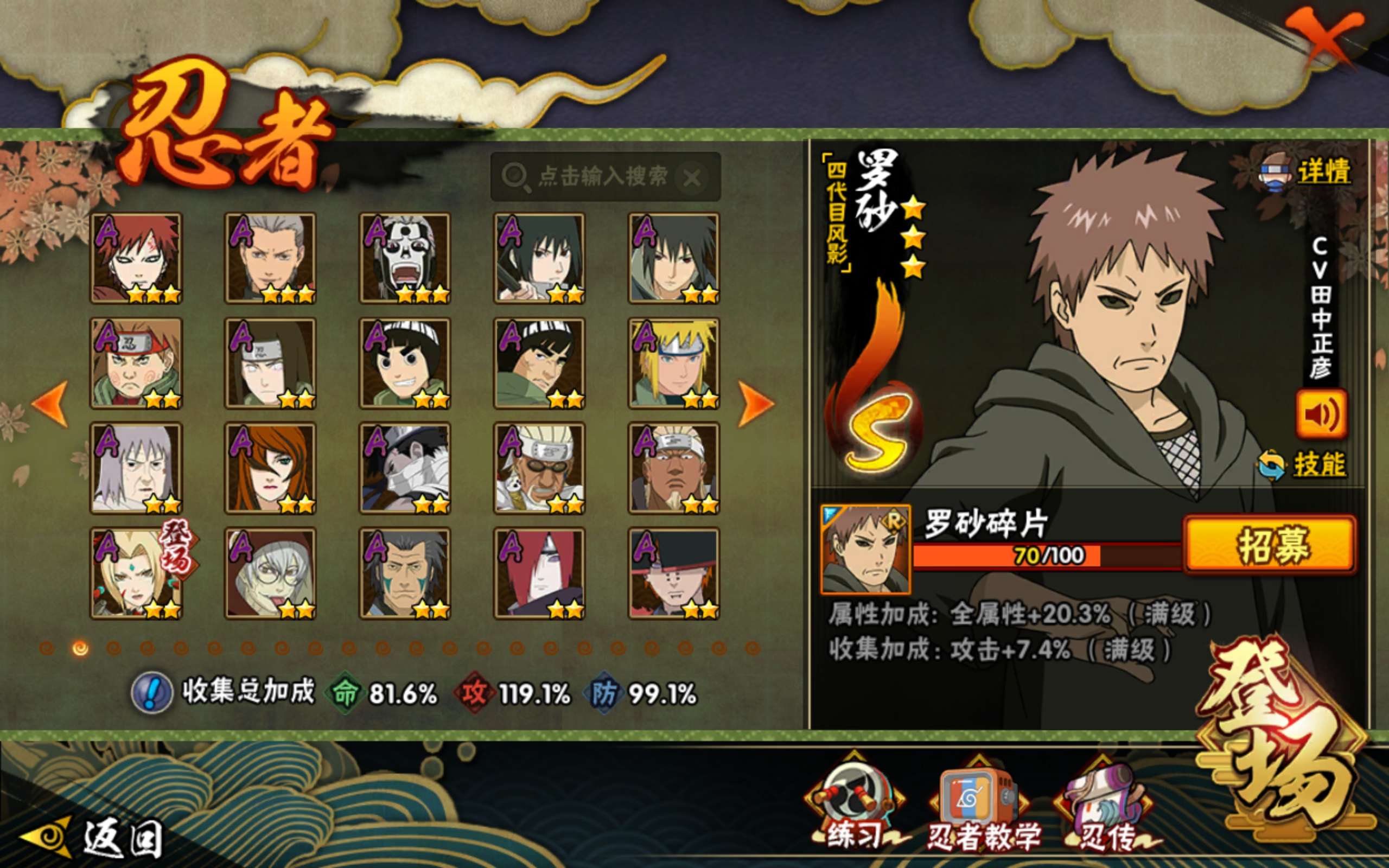 【S级忍者】旗木卡卡西「须佐能乎」(3星),宇智波斑「秽土转生·解」(3星),宇智波佐助「永恒万花筒」(3星),艾「忍界大战」(3星),春野樱「忍界大战」(3星),千手柱间「秽土转生」(3星),漩涡鸣人「九喇嘛连结