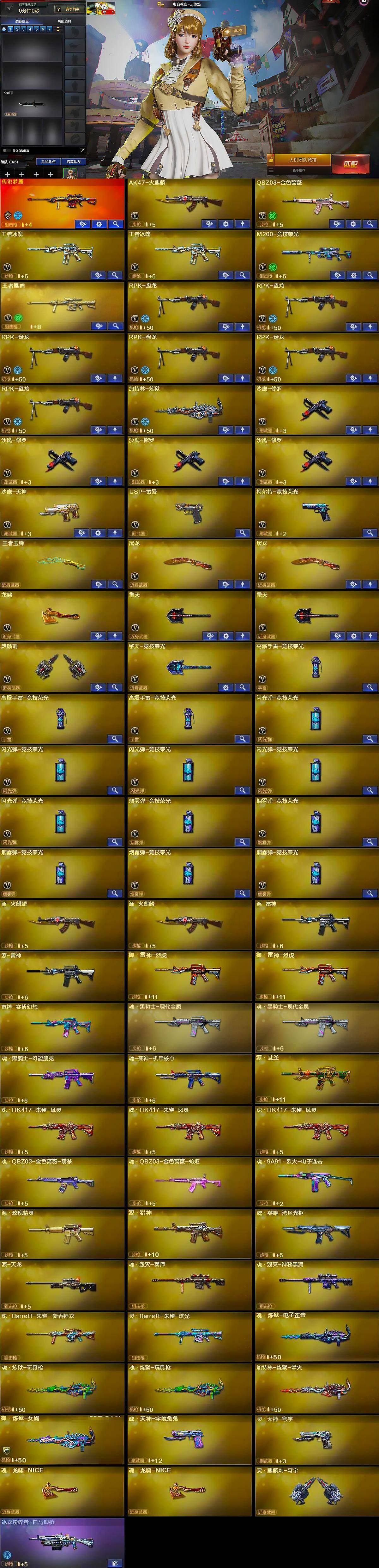 【英雄级武器】:AK47-火麒麟,QBZ03-金色蔷薇,王者冰魄-觉醒版*2,M200-竞技荣光,王者凰鸣-觉醒版,RPK-盘龙*6,加特林-炼狱,沙鹰-修罗*4,沙鹰-天神,USP-雷暴,柯尔特-竞
