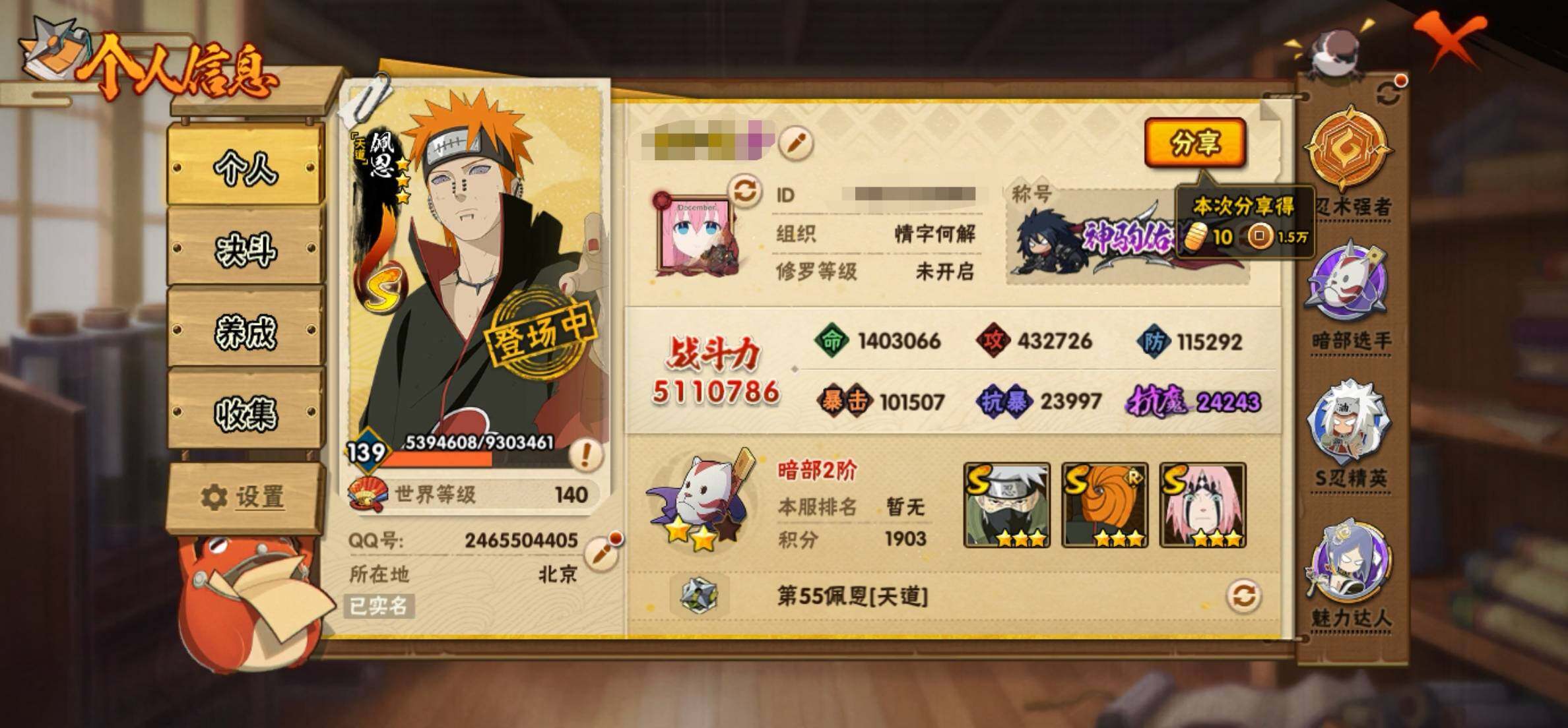 【HYX3699】V10/战力511W/S忍10/A忍31/忍界大战-日向宁次/2星大野木「侠隐江湖」/疾风传-我爱罗/死司凭血-飞段/须佐能乎-旗木卡卡西/侠隐江湖-药师兜/2星小南「神驹佑将」/3星飞段/天道-佩恩/3星漩涡鸣人·宇智波佐助/忍界大战-秋道丁次/4星波风水门/2星角都「秽土转生」/3星干柿鬼鲛/忍界大战-李洛克/2星旗木卡卡西「神威对决」/青年-波风水门/2星蝎「绯流琥」/舞之豪杰-自来也/3星漩涡鸣人「暴怒·第六尾」/百豪-春野樱/秽土转生-迪达拉/最终章-日向雏田/2星神