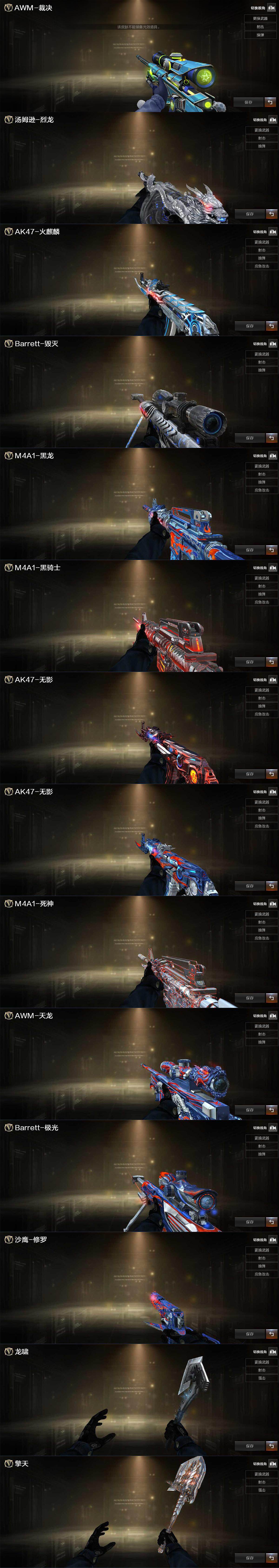 【皮肤】:裁决-胜者为王 皮肤,烈龙-星空,火麒麟-雷神,毁灭-星空,黑龙-能量核心,黑骑士-暗月*3,无影-暗月,无影-能量核心,死神-秘银,天龙-能量核心,极光-能量核心,修罗-能量核心,轻型军用手斧-再燃火线,擎天-秘