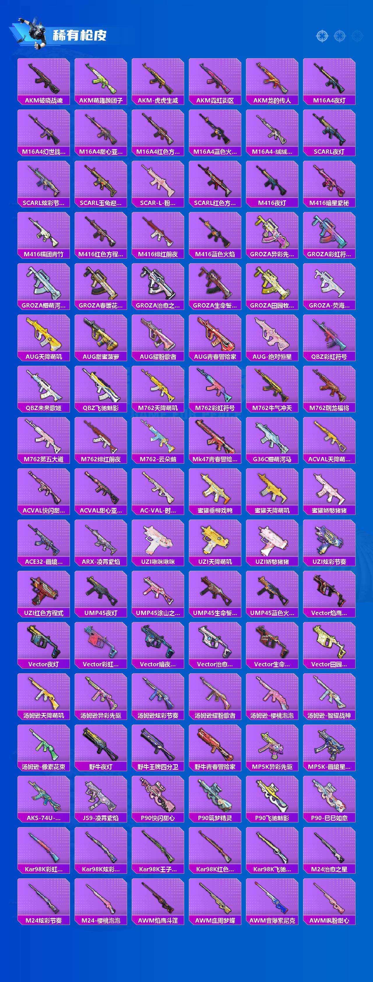 【粉色枪皮等级】:SCAR-L-锦绣绵绵(五级),M416-电玩时刻(五级),AUG-暖羊咩咩(五级),UMP45-量子极限(五级),AKS-74U-星穹咏叹调(七级),Kar