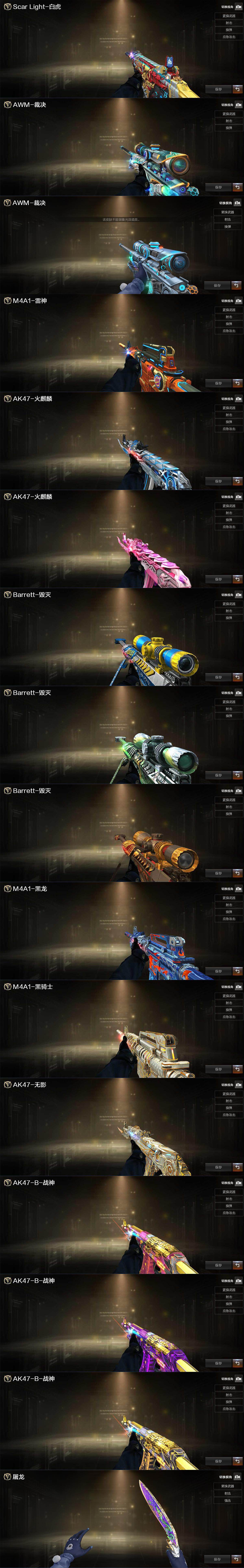 【热门武器】:传说圣谕,QBZ03-金色蔷薇*2,M200-幻神,死亡之眼,C.A.T,M4A1-黑骑士*2,汤姆逊-烈龙*5,RPK-盘龙,加特林-炼狱,COP-堕天神,沙鹰-修罗*2