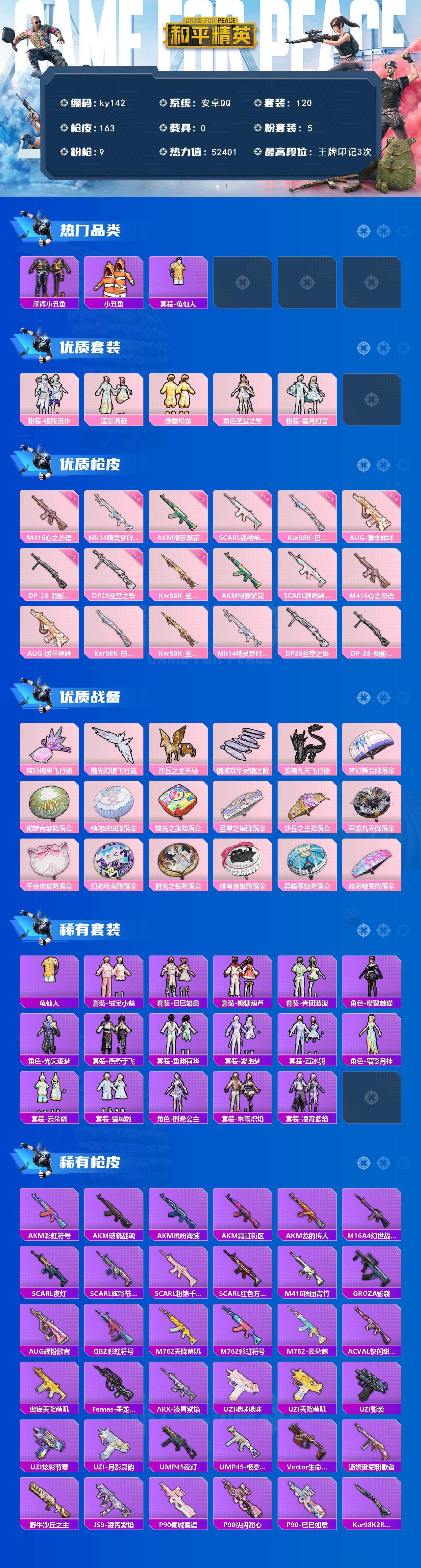 安卓 手Q-5粉装-9特效枪-0载具-5粉色飞行器-52401热力值-3王牌印记-120套装-163枪皮