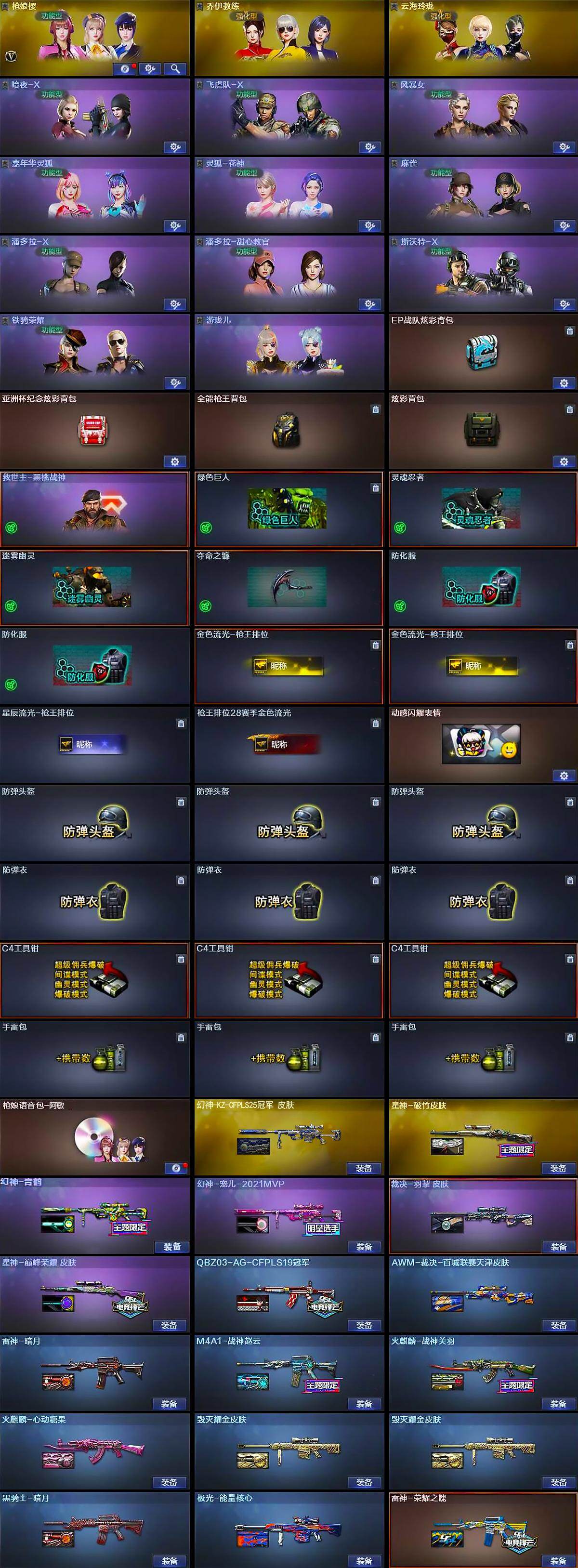 【皮肤】:幻神-青鹤,幻神-宠儿-2021MVP,幻神-KZ-CFPLS25冠军 皮肤,QBZ03-AG-CFPLS19冠军,AWM-裁决-百城联赛天津皮肤,裁决-羽掣 皮肤,星神-破竹皮肤,星神-巅峰荣耀 皮肤,雷神-暗月,雷神-荣耀之魄,M4A1-战神赵云,火麒麟-战神关羽,火麒