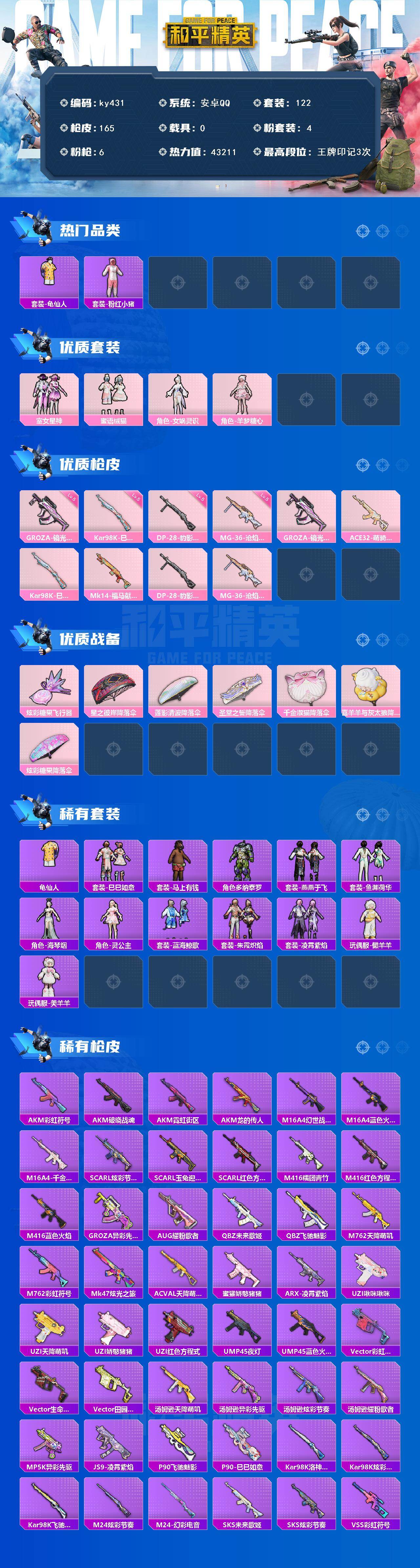 安卓 手Q-4粉装-6特效枪-0载具-1粉色飞行器-43211热力值-3王牌印记-122套装-165枪皮