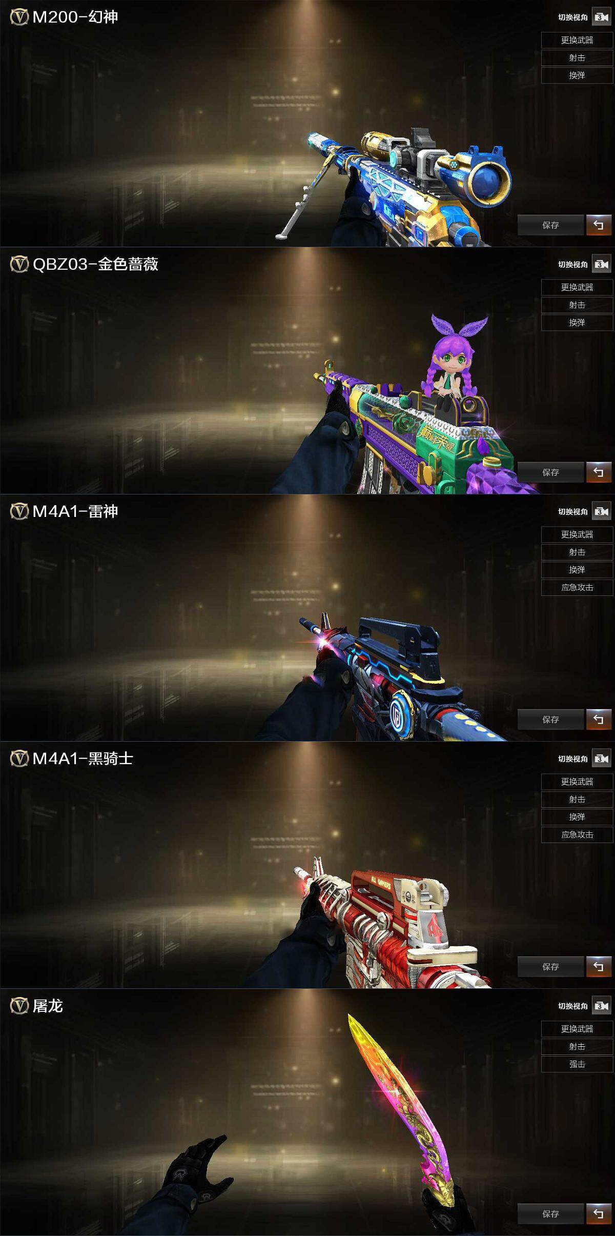 【热门武器】:传说灵眸,QBZ03-金色蔷薇,M200-幻神,M4A1-黑骑士,雷神-小红,毁灭-孙三炮,COP 357-幻灵*2,沙鹰-修罗*5