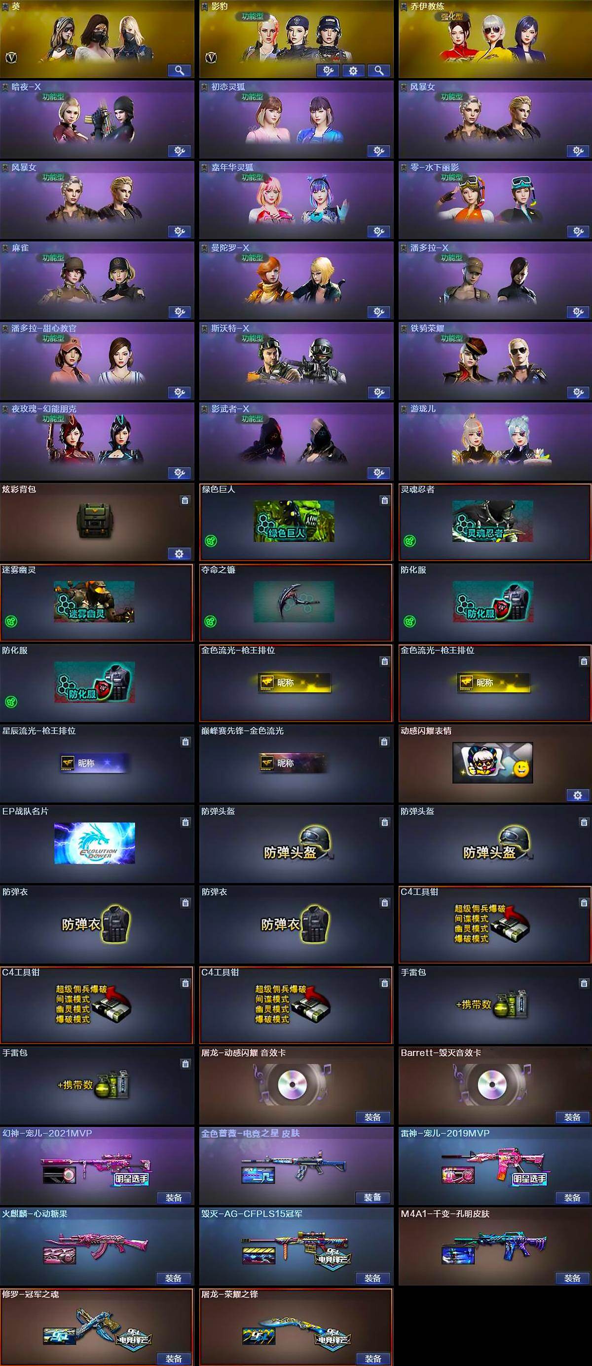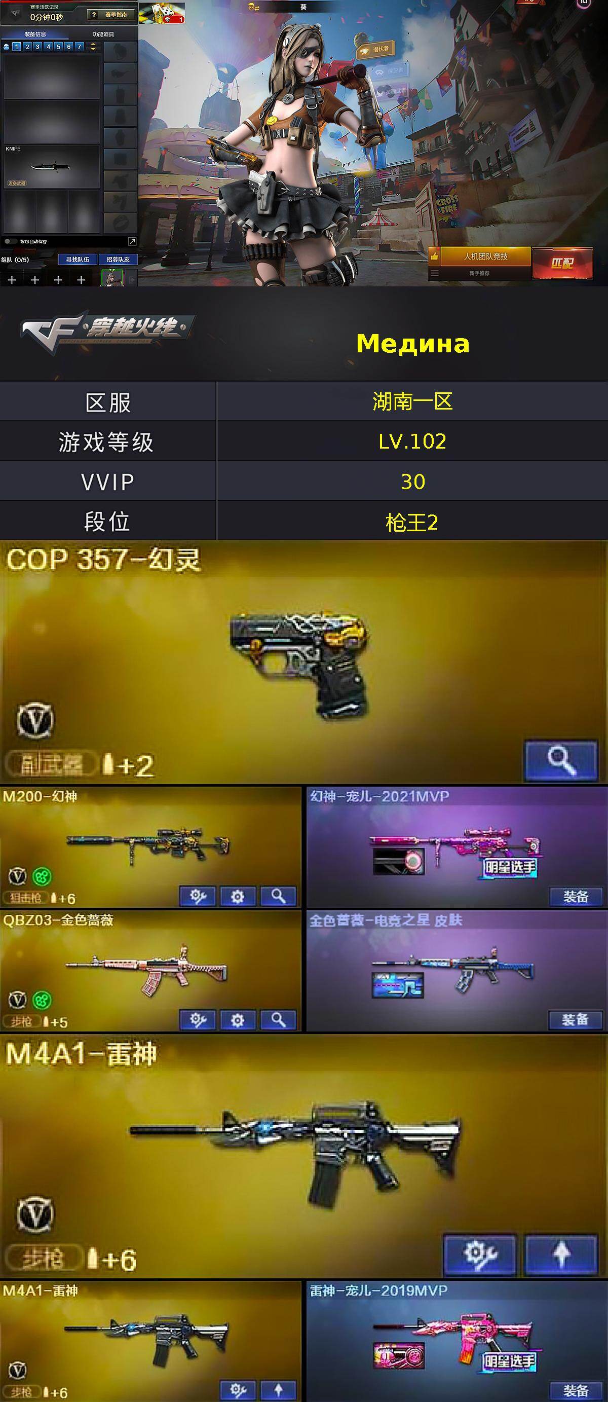 【皮肤】:幻神-宠儿-2021MVP,金色蔷薇-电竞之星 皮肤,雷神-宠儿-2019MVP,火麒麟-心动糖果,毁灭-AG-CFPLS15冠军,毁灭-英雄计划 皮肤,M4A1-千变-孔明皮肤,修罗-冠军之魂,屠龙-荣耀之锋