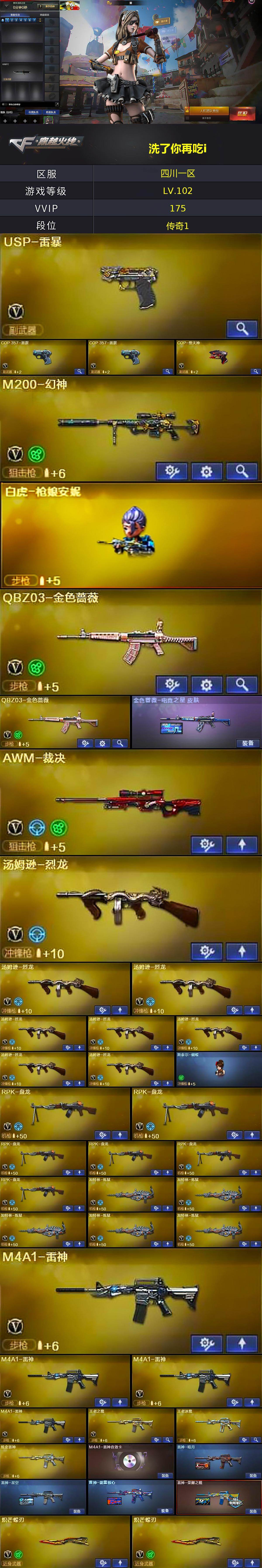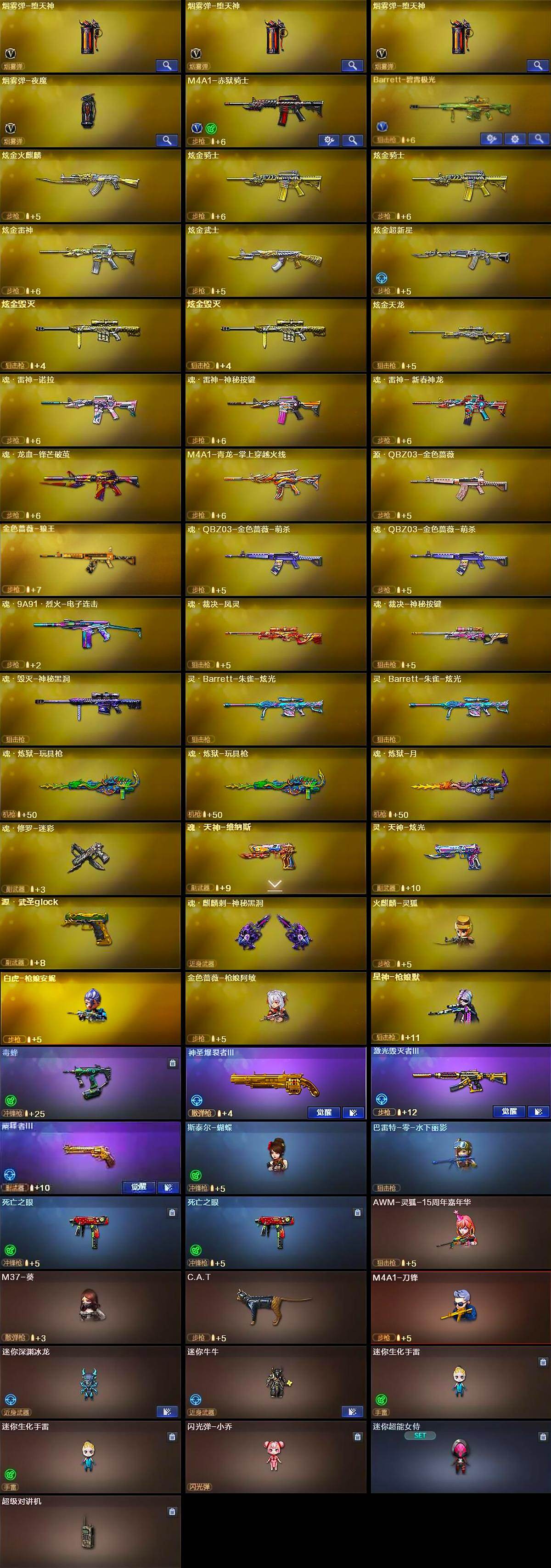 【热门武器】:QBZ03-金色蔷薇*2,HK417-朱雀,M200-幻神,死亡之眼*2,金色小号,C.A.T,毒蜂,M4A1-黑骑士*6,汤姆逊-烈龙*8,RPK-盘龙*6,加特林-炼狱*5,斯泰尔-蝴蝶,白虎-枪娘安妮,USP-雷暴,COP-堕天神,沙鹰-修罗*8,炽芒蝶刃*2