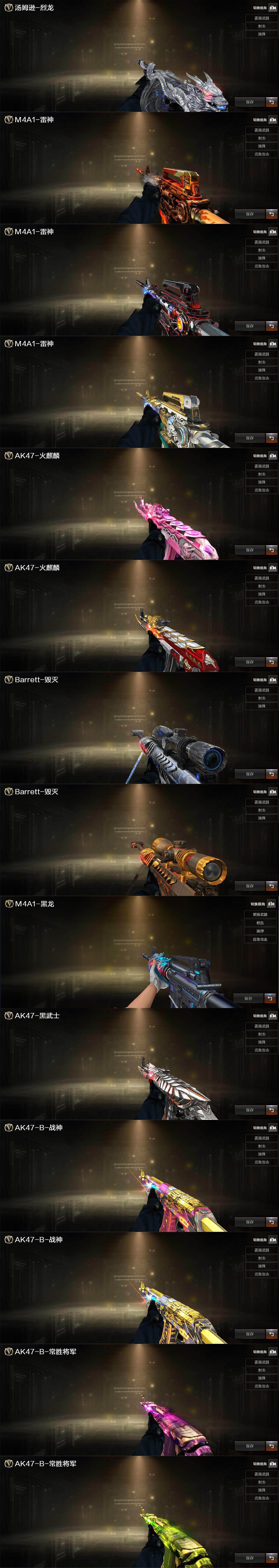 【皮肤】:烈龙-星空,雷神-暗月,雷神-虎将,雷神-烈虎皮肤,火麒麟-华夏之心,火麒麟-心动糖果,毁灭-星空,毁灭-英雄计划 皮肤,M4A1-黑龙-361,AK47-黑武士-361,战神-粉色甜心皮
