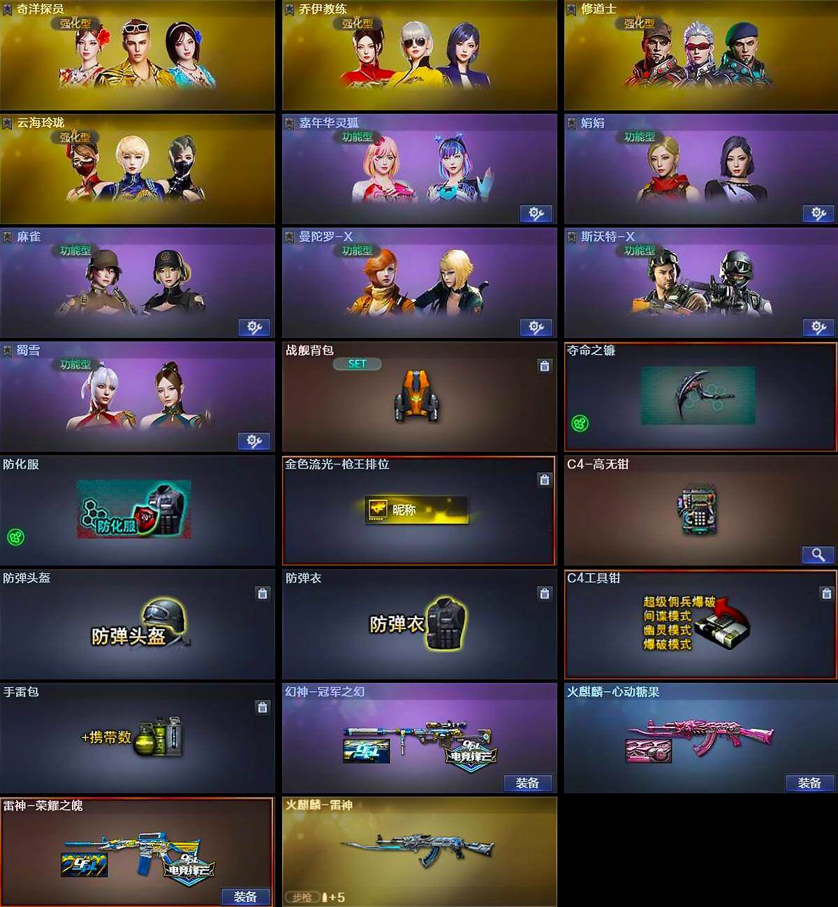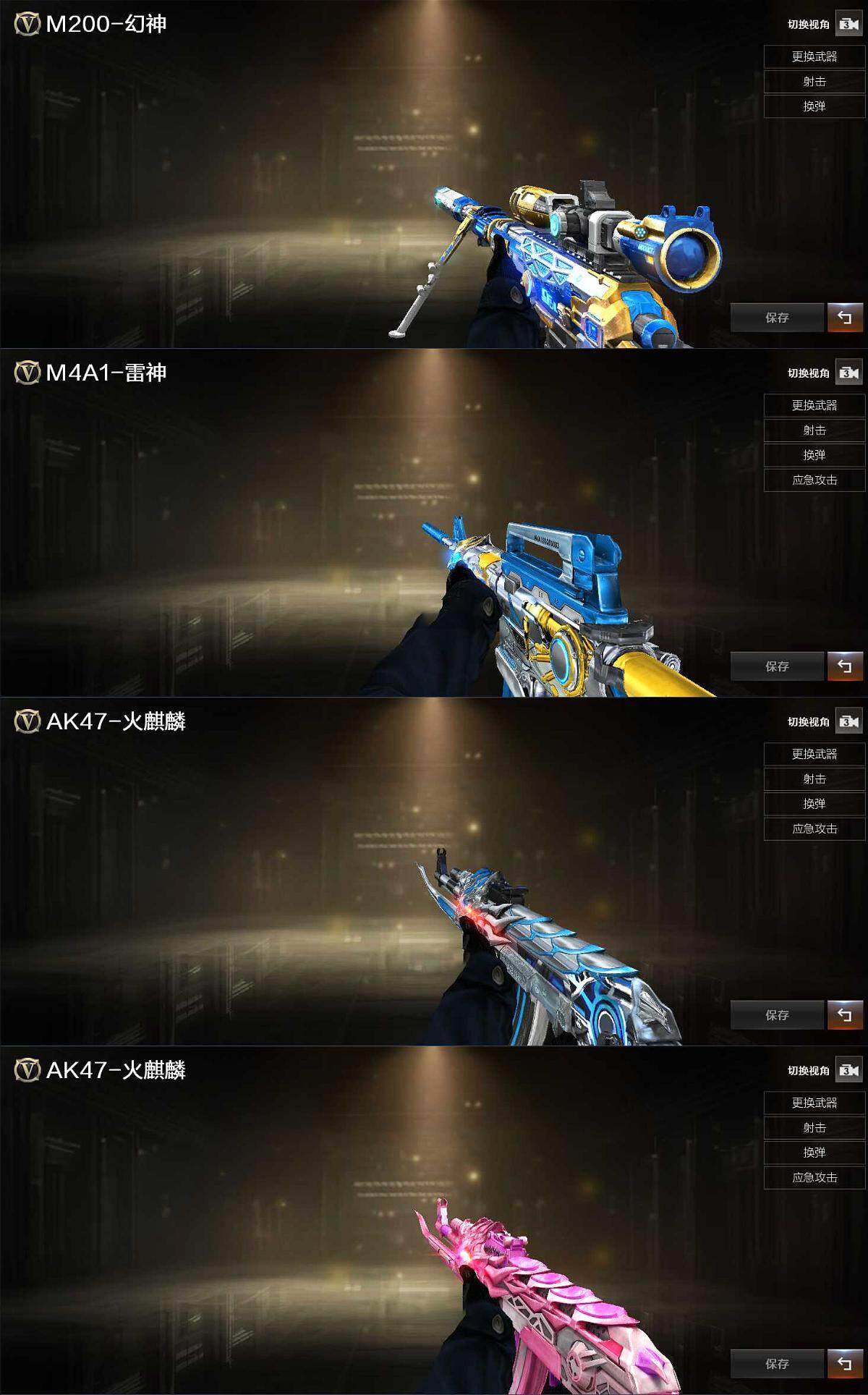 【英雄级武器】:AK47-火麒麟*3,M4A1-雷神,无影-神兵利器,AWM-天龙,柯尔