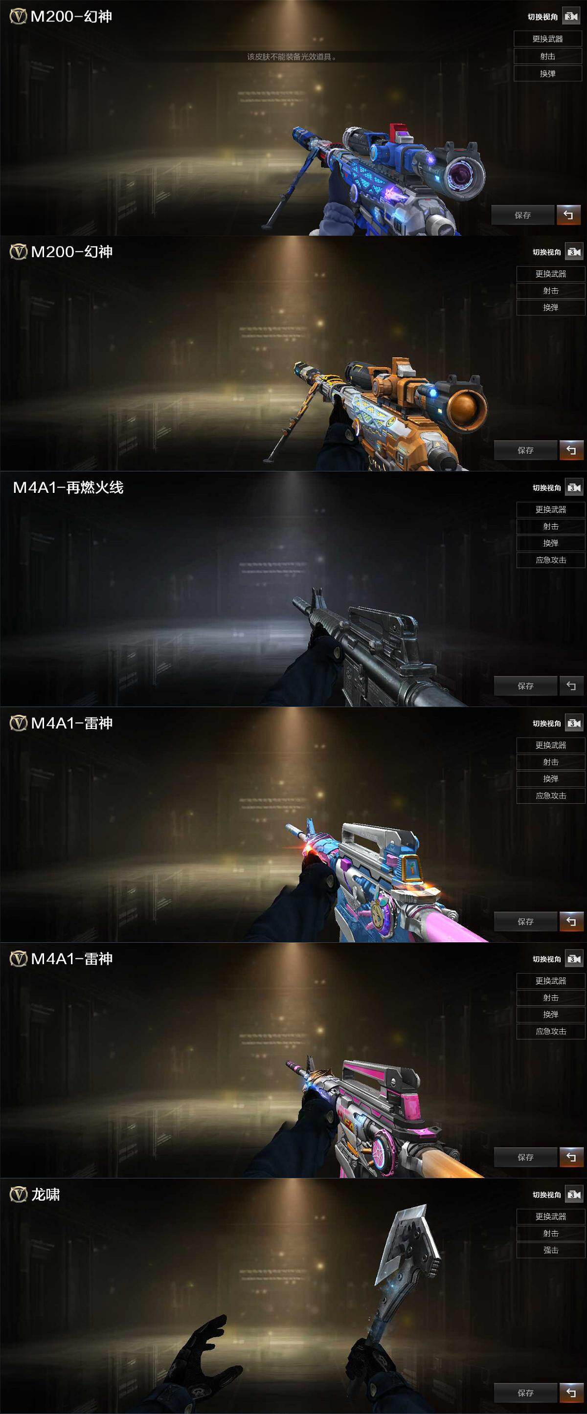 【皮肤】:M200-幻神-黄忠皮肤,幻神-电竞之星 皮肤,雷神-宇航兔皮肤,M4A1-再燃火线,雷神-神秘按键 皮肤,轻型军用手斧-再燃火线
