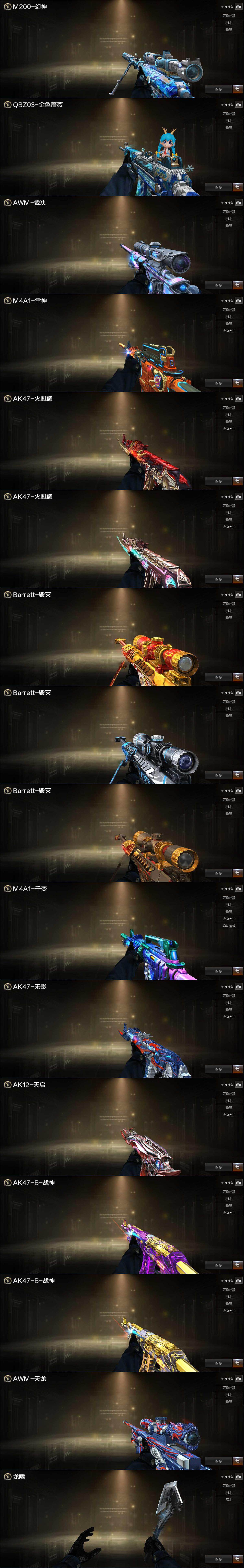 【皮肤】:幻神-荣耀世冠EP 皮肤,QBZ03-荣耀世冠EP 皮肤,裁决-流光秘银,雷神-源计划2.0专属 皮肤,火麒麟-平天大圣,火麒麟-百城,毁灭-黑大圣皮肤,毁灭-风暴*2,毁灭-英雄计划 皮肤,M4A1-千变-孔明皮肤,无影-能量核