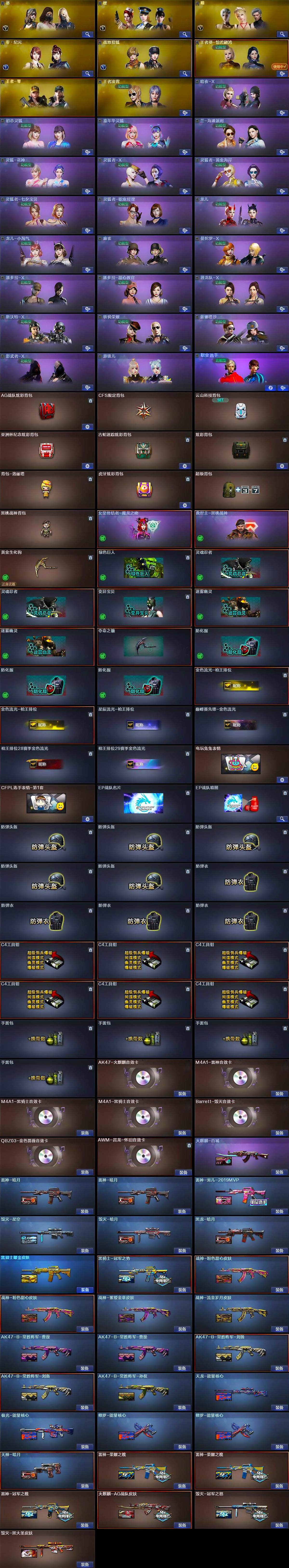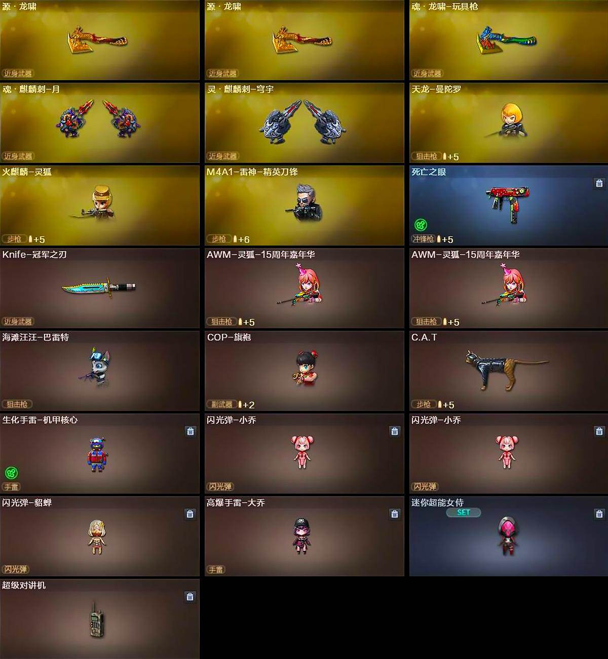 【热门武器】:QBZ03-金色蔷薇,HK417-朱雀,M200-幻神,死亡之眼,白虎-电玩蓝兔,柯尔特-冠军之特*2,王者炎心,金色小号,C.A.T,M4A1-黑骑士*2,汤姆逊-烈龙*6,加特林-炼狱*3,USP-雷暴,COP-堕天神,沙鹰-修罗*4,Knife-冠军之刃