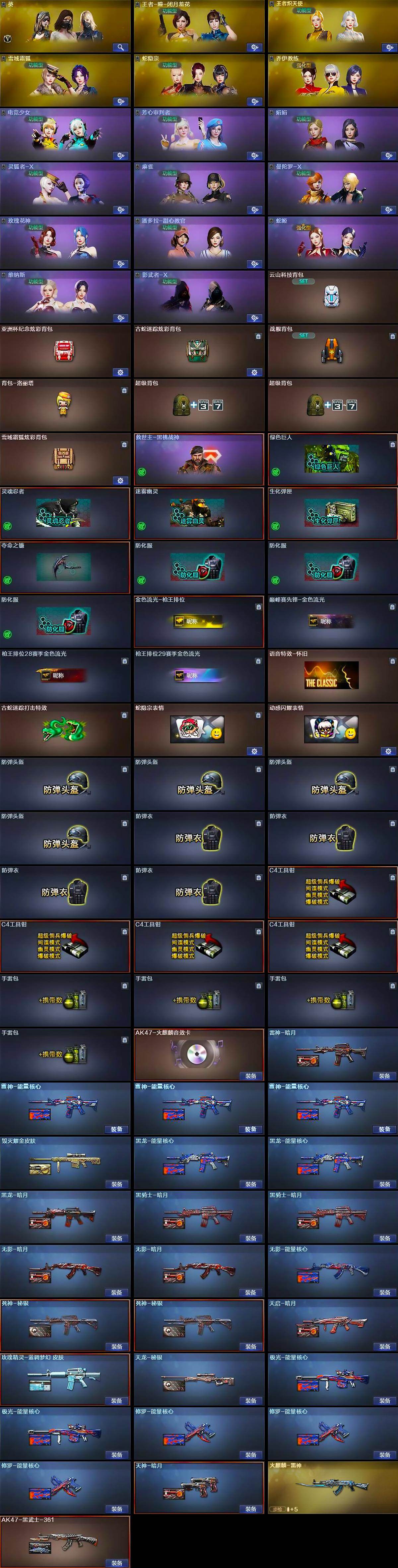 【皮肤】:雷神-暗月,雷神-能量核心*3,火麒麟-雷神,毁灭耀金皮肤,黑龙-能量核心*2,黑龙-暗月,黑骑士-暗月*2,无影-暗月*2,无影-能量核心,死神-秘银*2,AK47-黑武士-361,天启-暗月,玫瑰精灵-蓝调梦幻 皮肤,天龙-秘银,极光-能量核心*2,修罗-