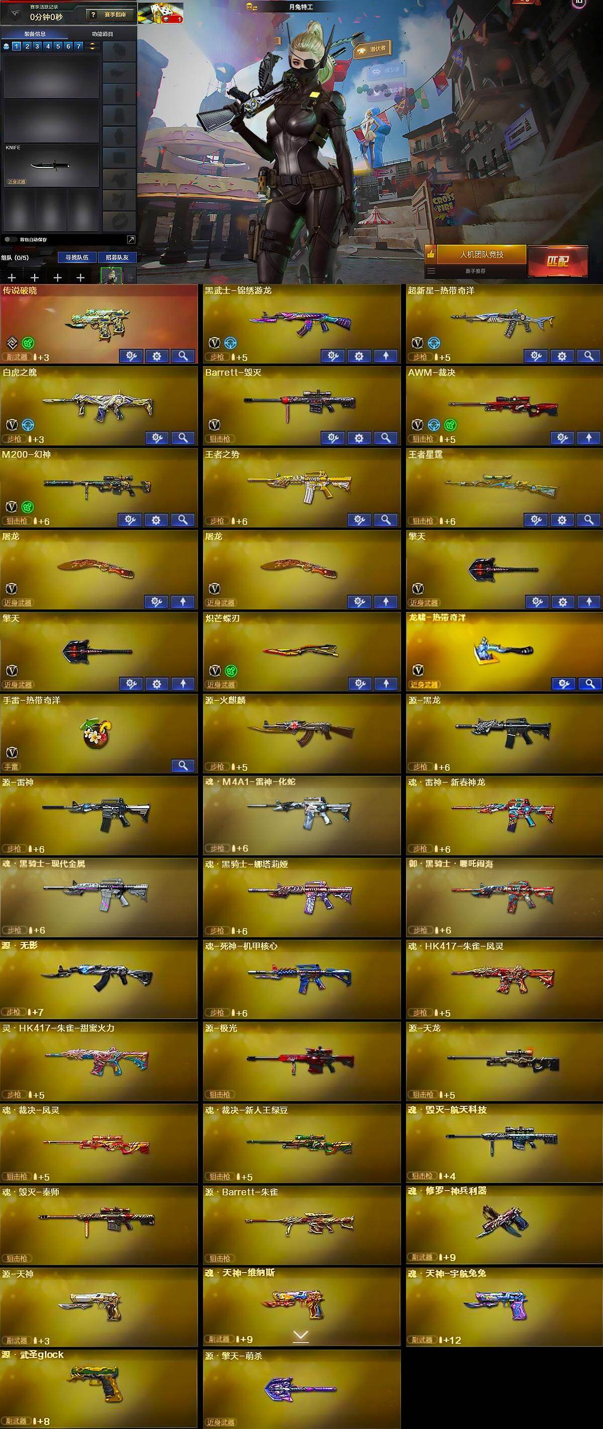 【英雄级武器】:黑武士-锦绣游龙,超新星-热带奇洋,白虎之魄-觉醒版,Barrett-毁灭,AWM-裁决,M200-幻神,屠龙*2,擎天*2,炽芒蝶