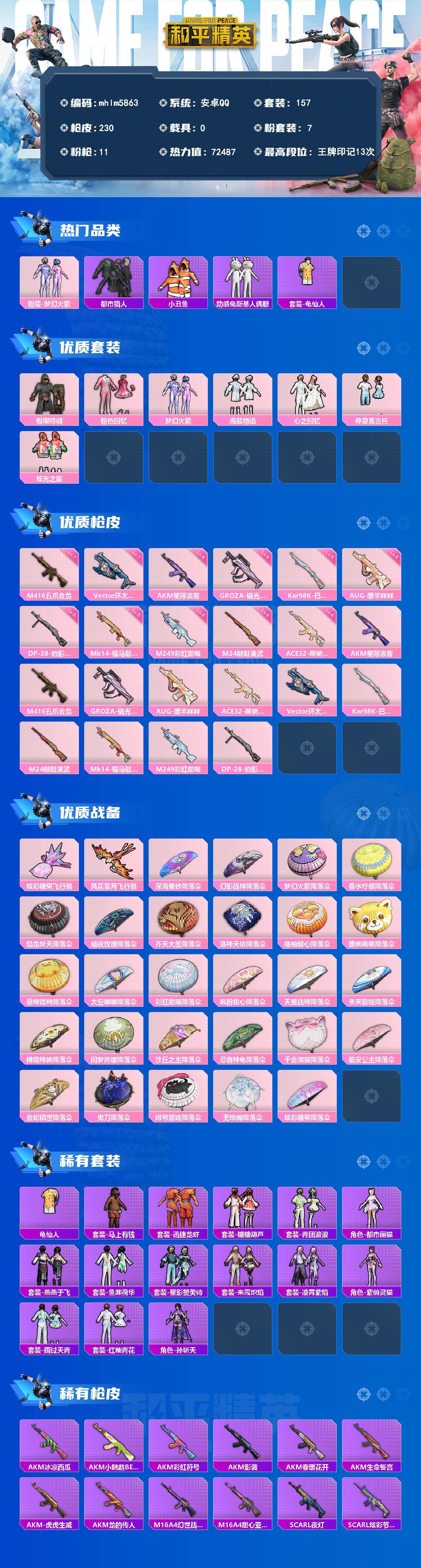 安卓 手Q-7粉装-11特效枪-0载具-2粉色飞行器-72487热力值-13王牌印记-157套装-230枪皮