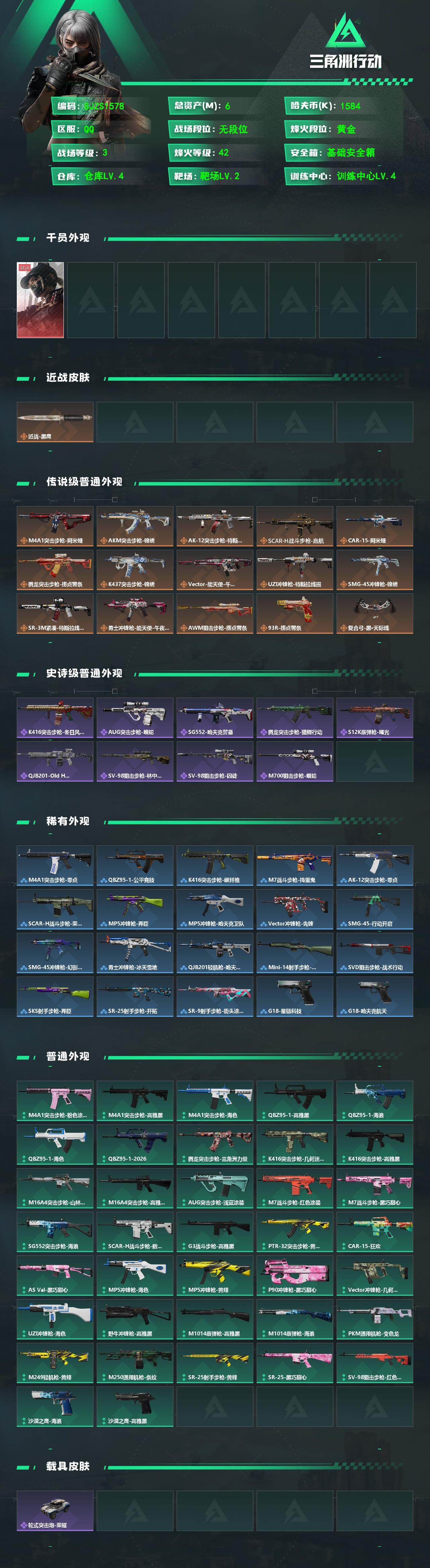总资产(M):6M/哈夫币(K):1584K/传说枪皮数:15/全面战场等级:3_段位:无段位/烽火地带等级:42_段位:黄金/露娜-黑·天际线/近战-黑鹰