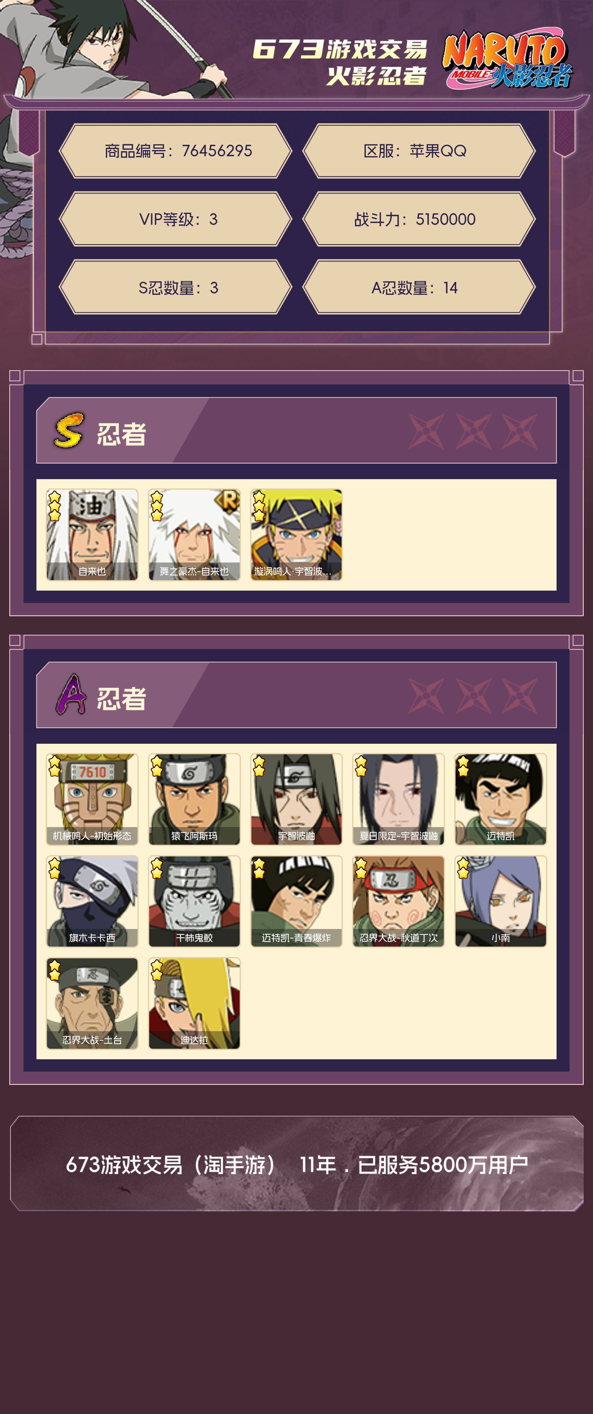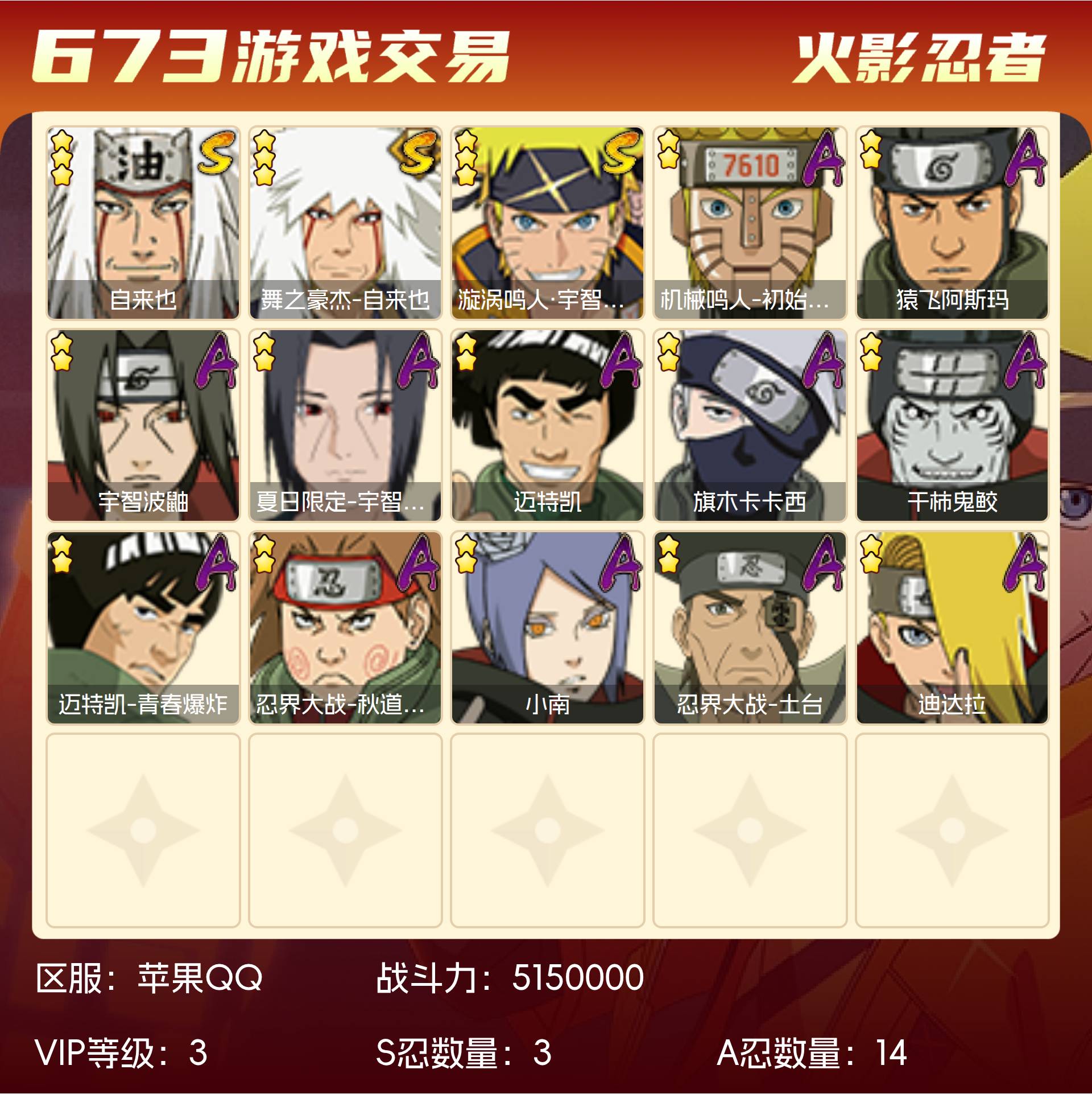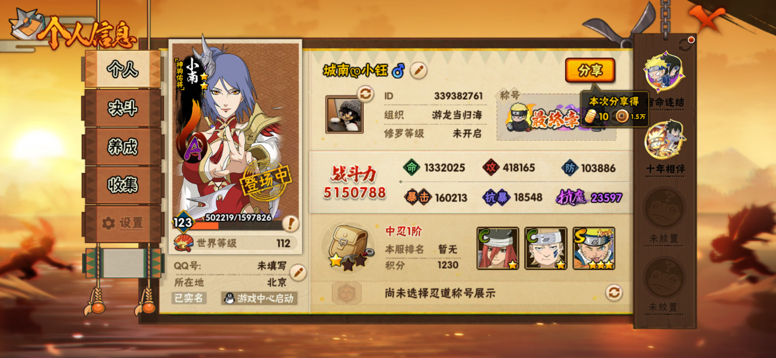 角色等级123 金币300 战斗力5150000 S忍3 A忍14 5星S忍者2 3 段位下忍