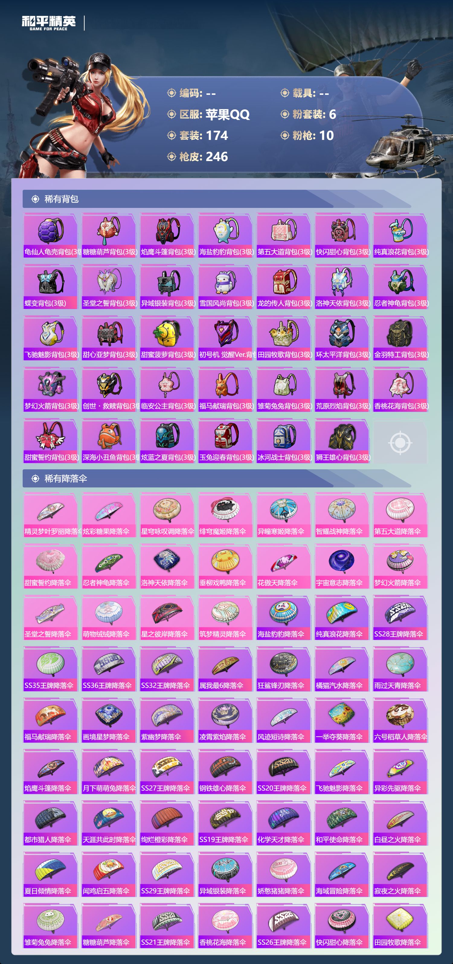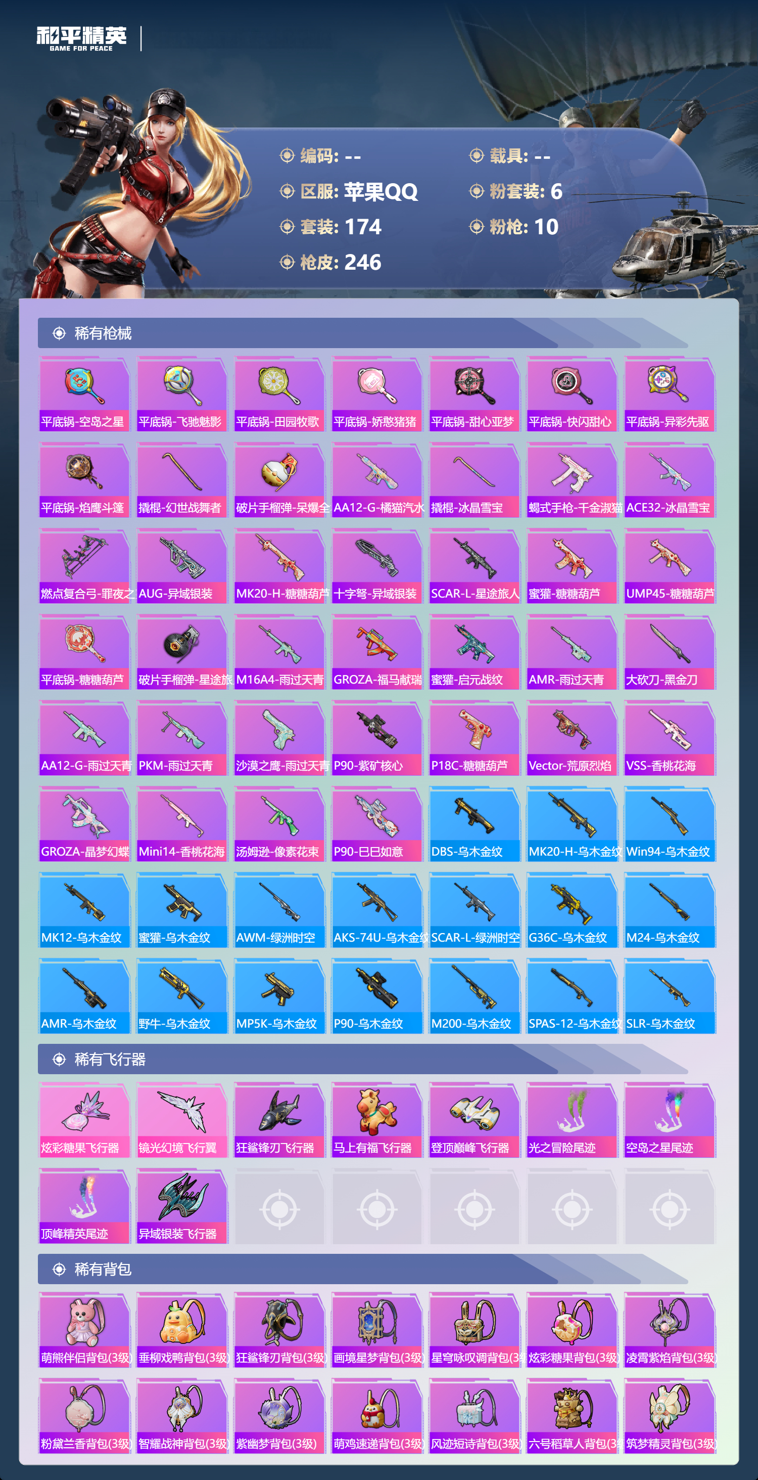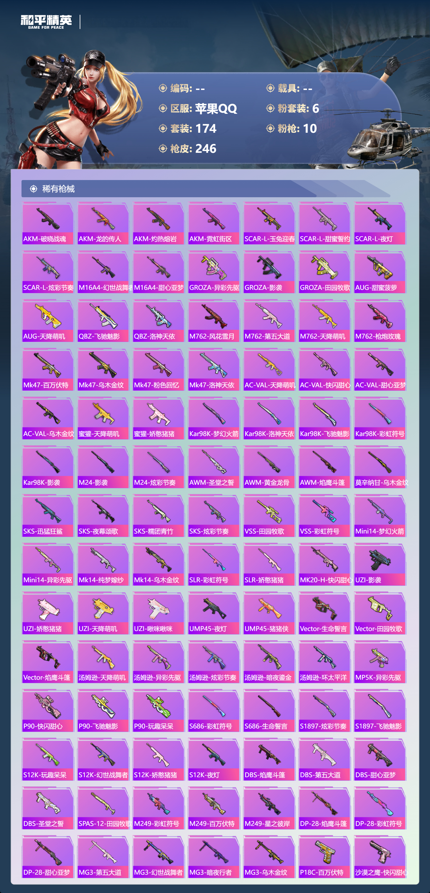 hs68226 苹果手Q-12王牌印记-6粉装-10特效枪-76410热力值-174套装-246枪皮-4卓越印记-3传奇印记