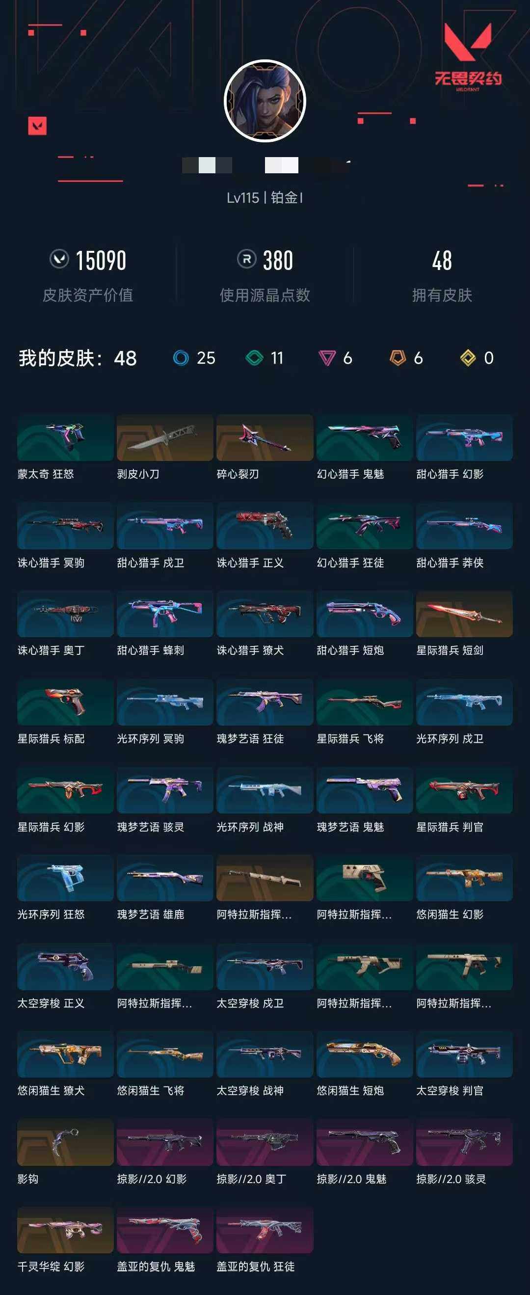 国服Q区 皮肤价值15090【6橙皮 0金皮 6紫皮 48皮肤 29英雄 82卡面 380已用源晶】铂金 优质皮肤:影钩、剥皮小刀、狂徒-盖亚的复仇、幻影-千灵华绽