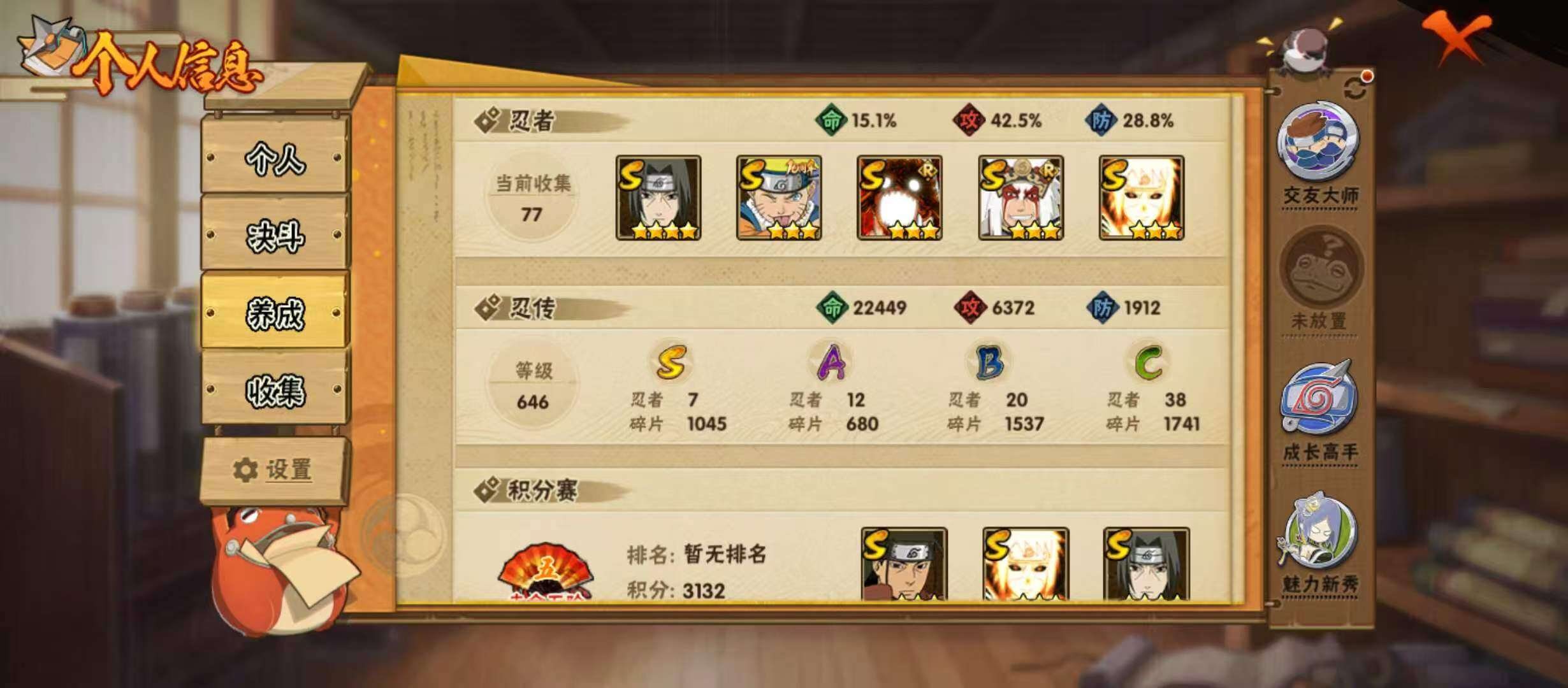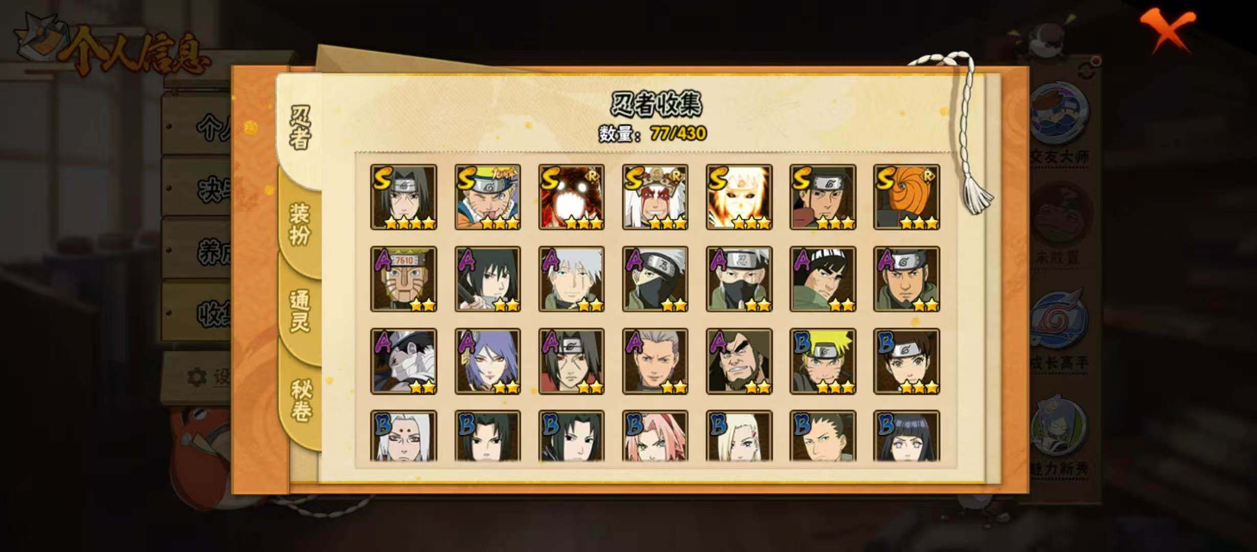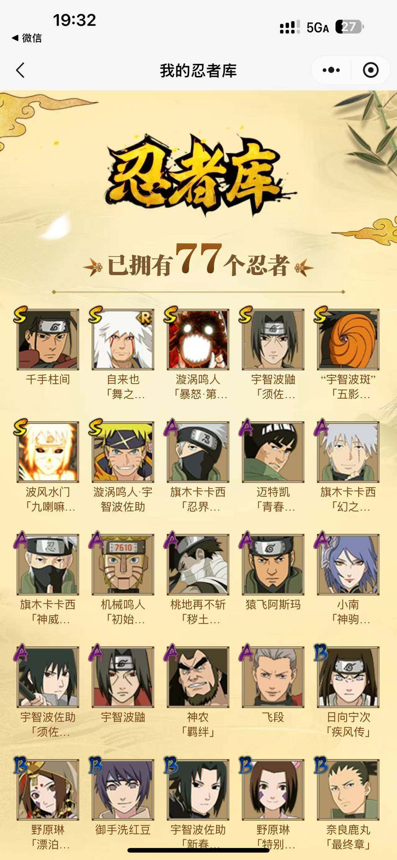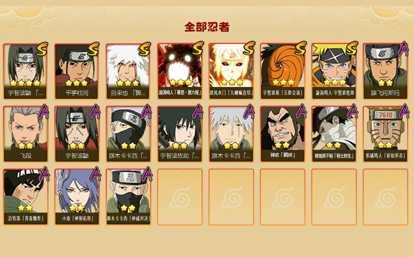 可改实名*7S级忍者数-12A级忍者数【S级忍者】:宇智波鼬「须佐能乎」(4星),自来也「舞之豪杰」(3星),千手柱间(3星),漩涡鸣人「暴怒·第六尾」(3星),波风水门「九喇嘛连结」(3星),宇智波斑「五影会谈」(3星),漩涡鸣人·宇智波佐助(3星)