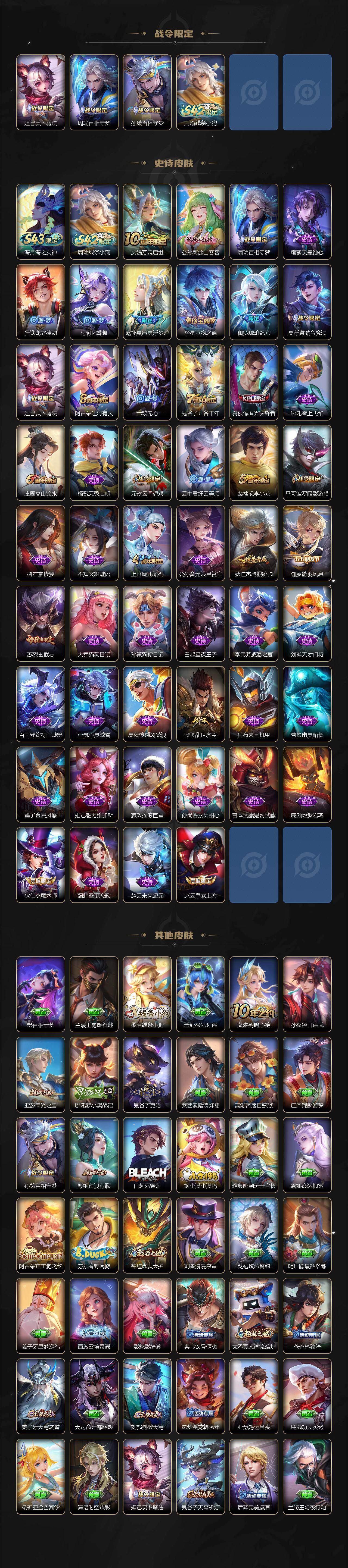 【限定皮肤】:夏侯惇霜北刀,姜子牙天穹之誓,狄仁杰阴阳师,赵云皇家上将,墨子神迹守卫,庄周高山流水,高渐离玩趣恶龙,吕布猎兽之王,元歌云间偶戏,元歌无心,夏侯惇匿光决锋者,马可波罗暗影游猎,狄仁杰魔术师,狄仁杰万华元夜,狄仁杰神器狴