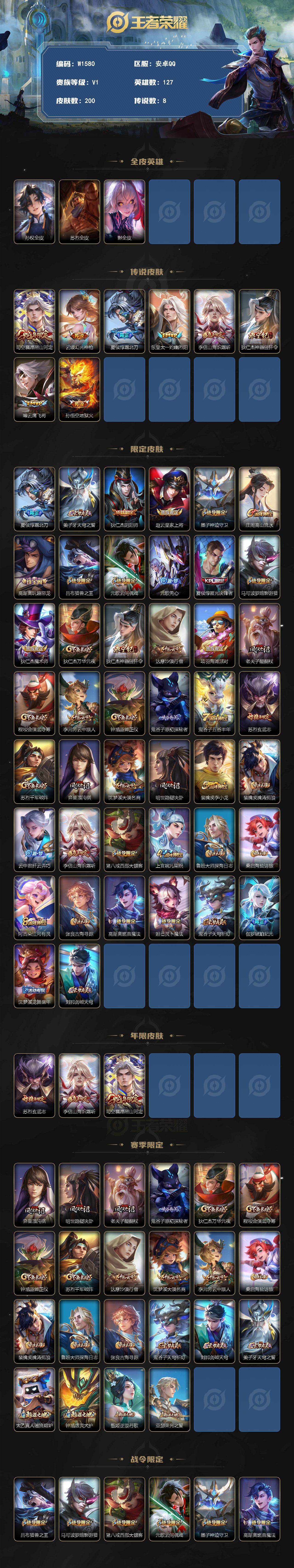 山海炽霜斩/神器狴犴令/愿照山河定/200皮肤8传说/霜北刀/匿光决锋者/玄武志/伽罗琥珀纪元/灼幽烈阳/云鹰飞将/地狱火/幻光神枪
