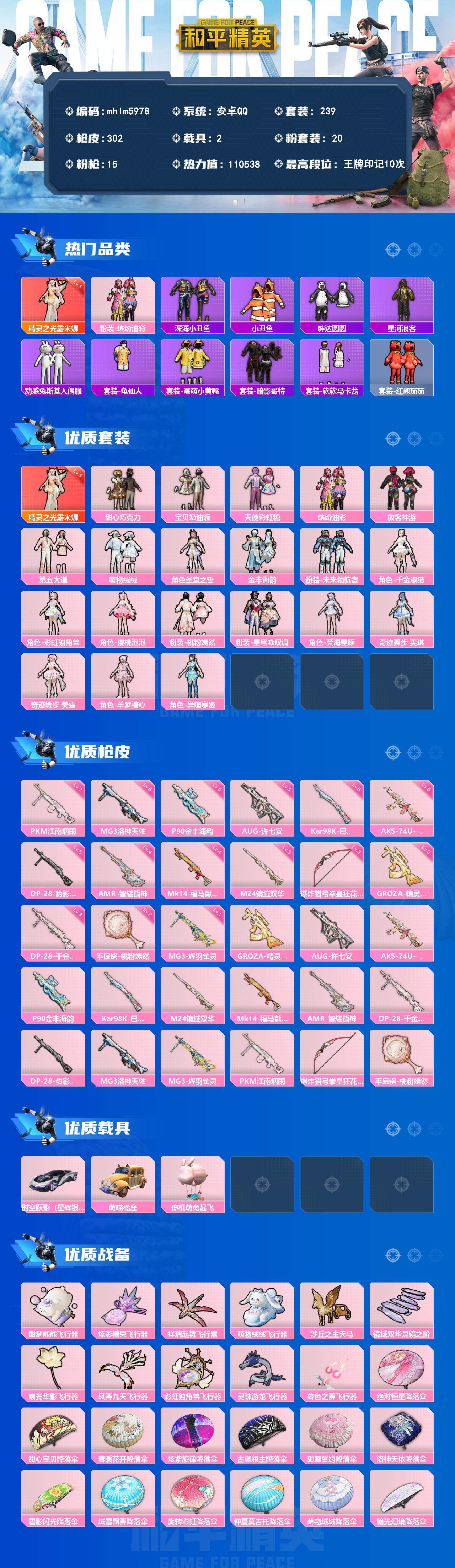 【mhlm5978】安卓 手Q-1神装-20粉装-15特效枪-2载具-11粉色飞行器-110538热力值-10王牌印记-239套装-302枪皮