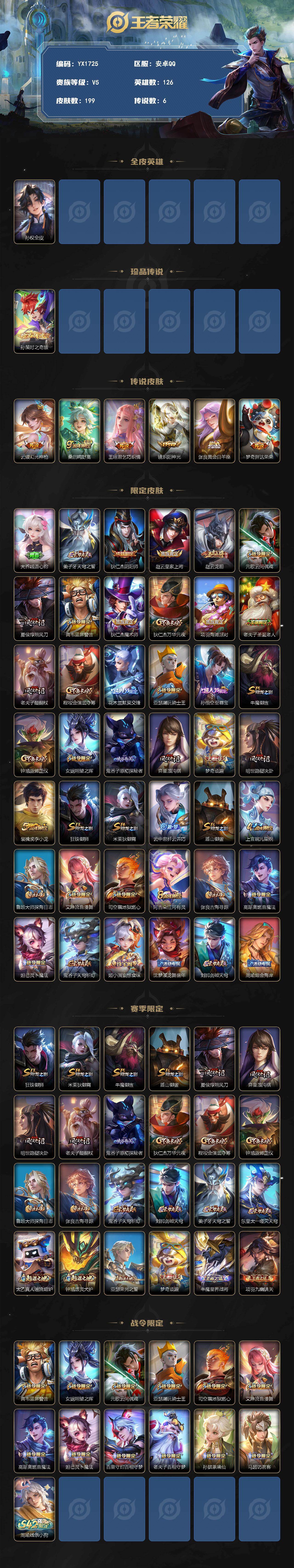 【时之奇旅/至尊宝/东方月初/龙胆】199皮肤1珍品传说6传说/炽阳神光/乞巧织情/幻光神枪/鸣野蒿/胖达荣荣/黄金白羊座