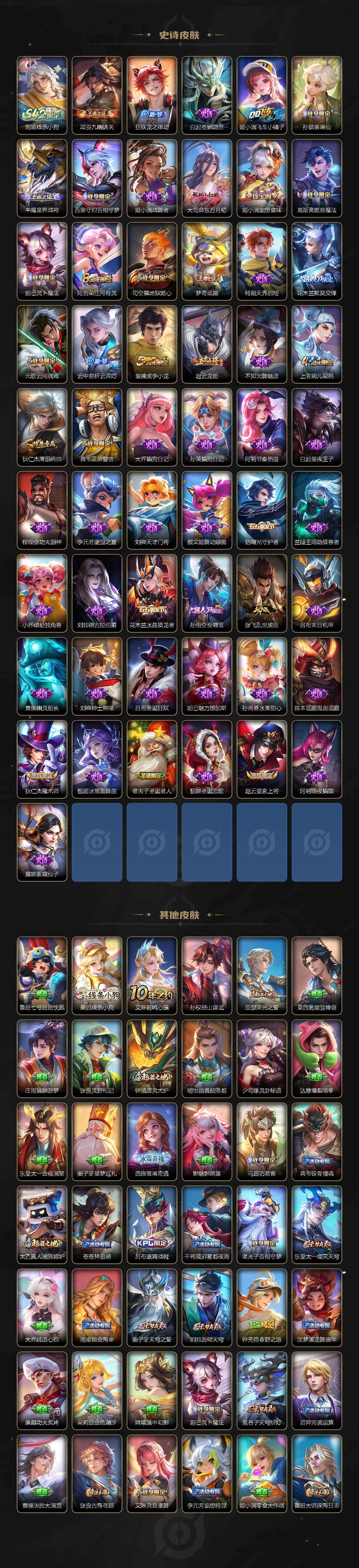 【限定皮肤】:大乔绒语心约,姜子牙天穹之誓,狄仁杰阴阳师,赵云皇家上将,赵云龙胆,元歌云间偶戏,夏侯惇朔风刀,典韦蓝屏警告,狄仁杰魔术师,狄仁杰万华元夜,项羽海滩派对,老夫子圣诞老人,老夫子醍醐杖,程咬金演武夺筹,花木兰默契交锋,亚瑟潮玩骑士王