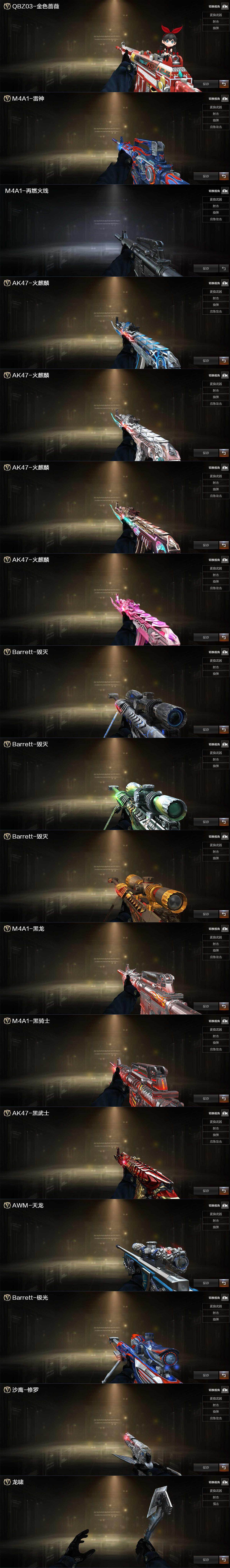 【热门武器】:QBZ03-金色蔷薇,M200-竞技荣光,M4A1-黑骑士,汤姆逊-烈龙,RPK-盘龙*2,加特林-炼狱*2,USP-雷暴,沙鹰-修罗