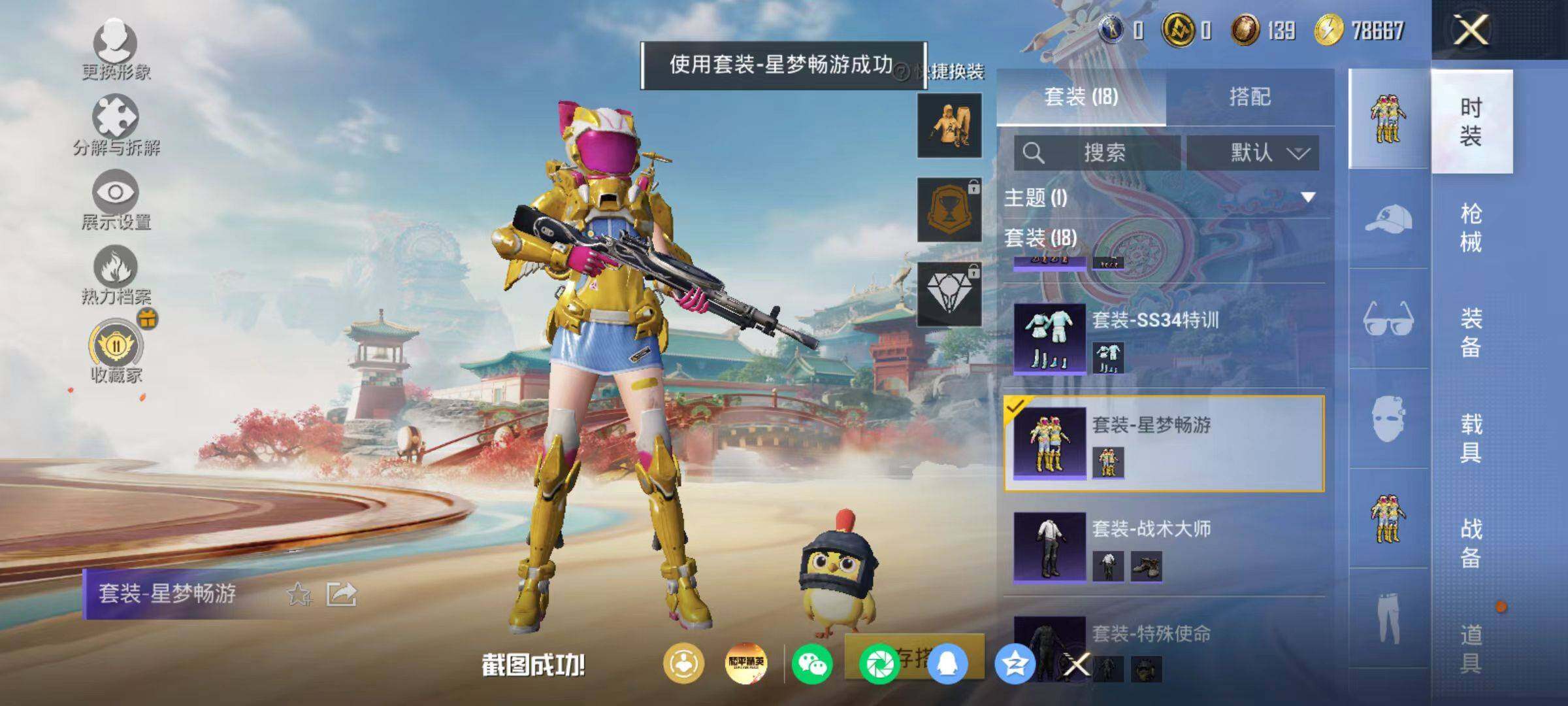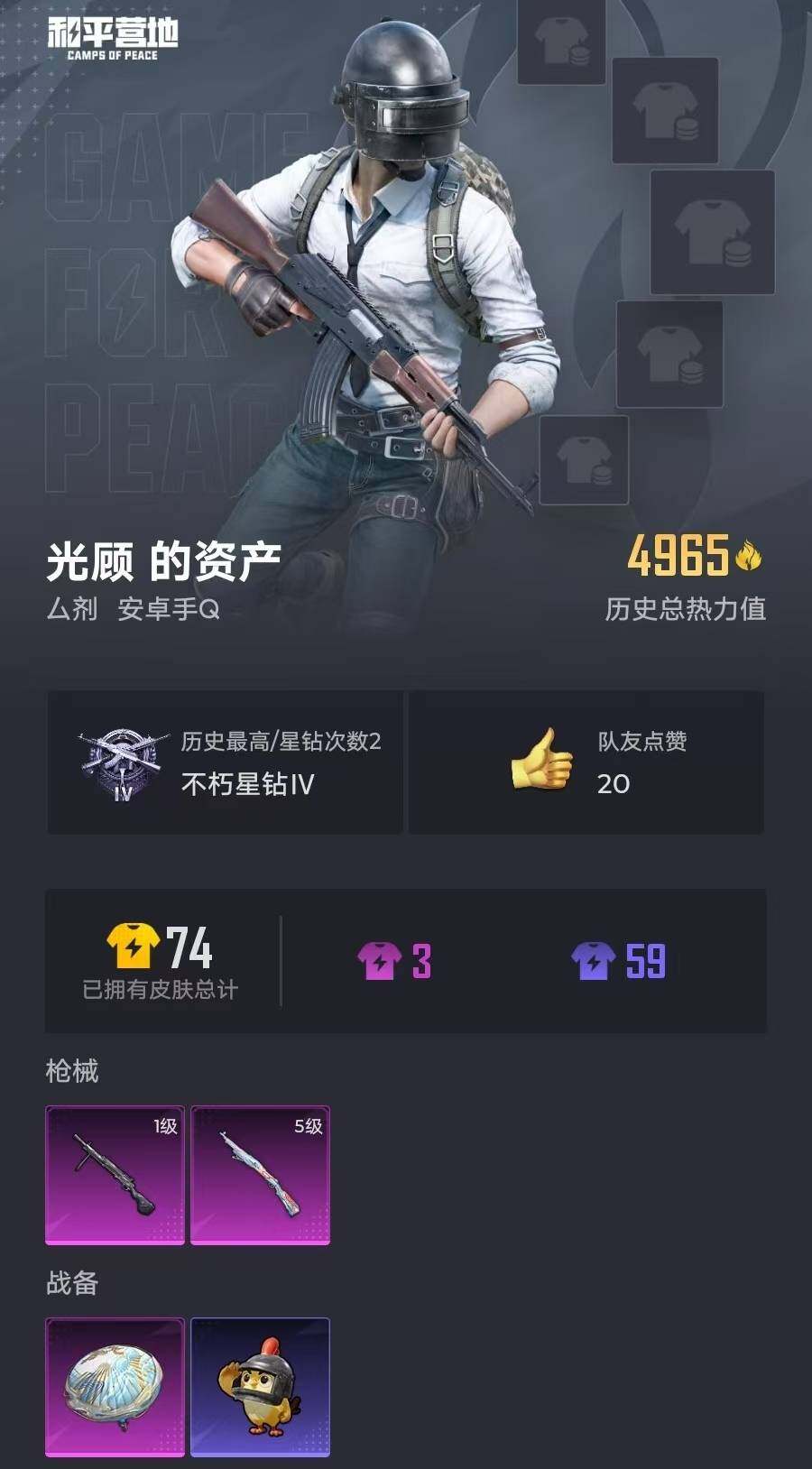 18套装/枪械2/装备24/战备14/热力值5115/五级Kar98K-巳巳如意/一级DP-28-豹影疾电/Kar98K-巳巳如意/DP-28-豹影疾电/金丰海韵降落伞/巳巳如意/SCAR-L-炫彩节奏/MK47-炫光之旅/汤姆逊-环太平洋/P90-巳巳如意/M24-影袭/S686-生命誓言/DP-28-彩虹符号/MG3-幻世战舞者/破片手榴弹-巳巳如意/橘黑制服/特殊使命/特训学院/猎鹰/红色
