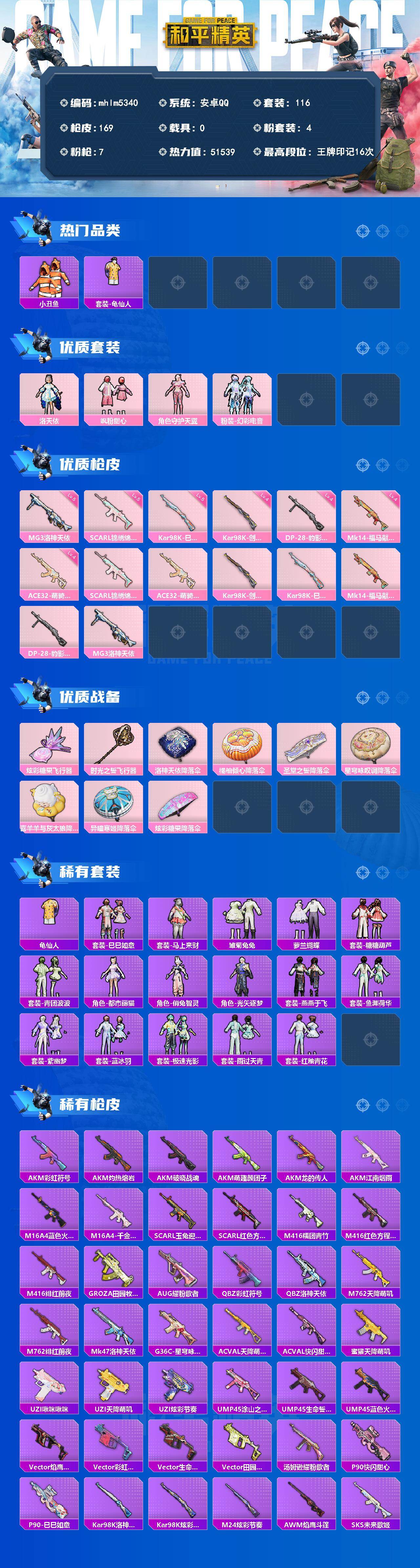 安卓 手Q-4粉装-7特效枪-0载具-2粉色飞行器-51539热力值-16王牌印记-116套装-169枪皮