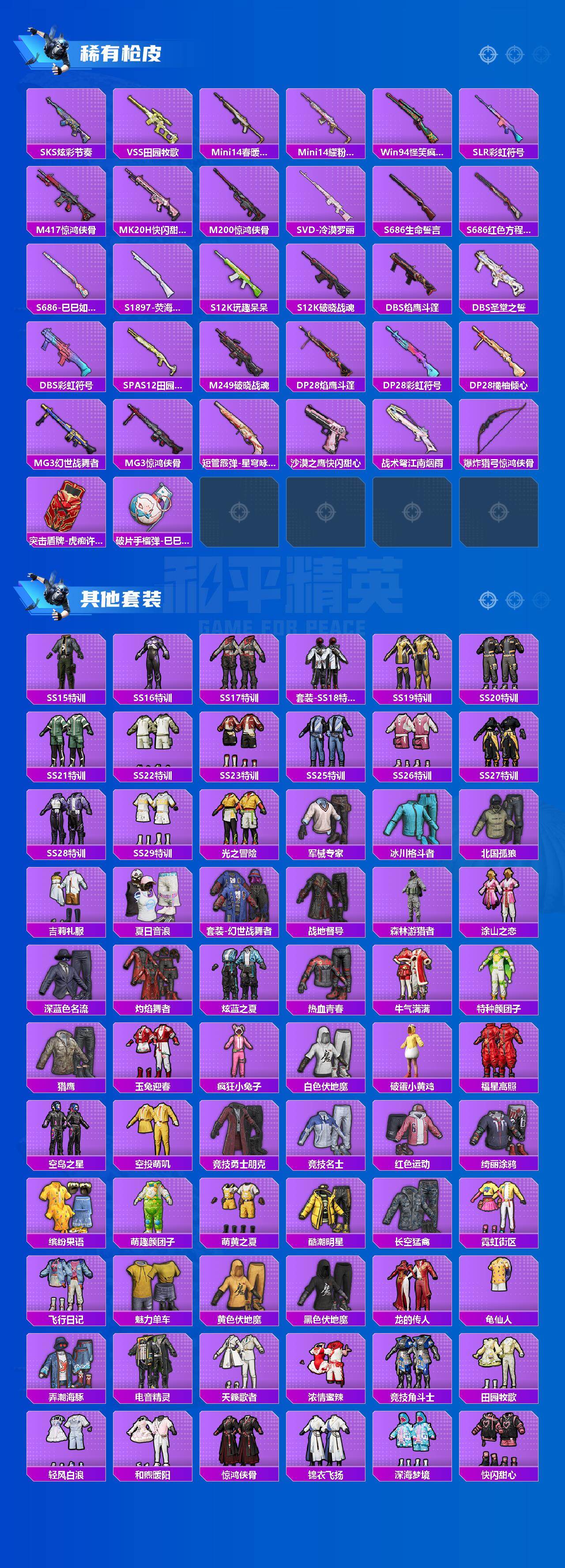 【粉色枪皮等级】:SCAR-L-锦绣绵绵(五级),ACE32-萌骑漫游(四级),Kar98K-创世·救赎(四级),Kar98K-巳巳如意(五级),Mk14-福马献瑞(四级),DP-28-豹影疾电(四级),MG3-洛神天依(五级)