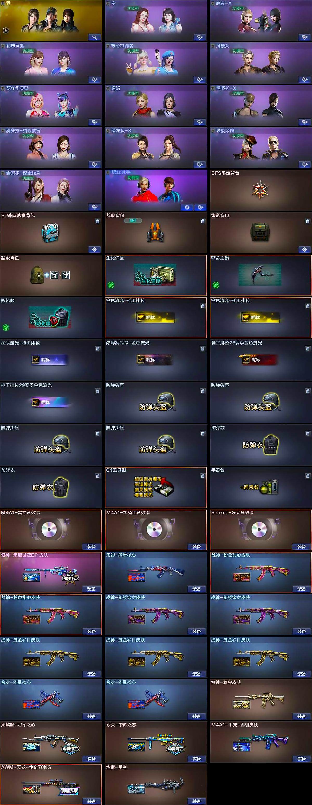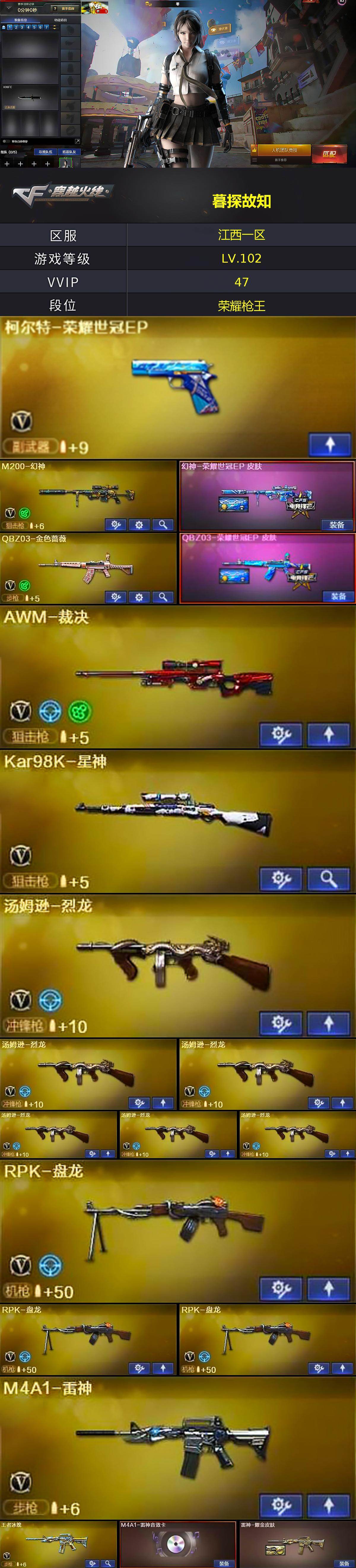 【热门武器】:QBZ03-金色蔷薇,M200-幻神,死亡之眼,Kar98K-星神,M4A1-黑骑士,汤姆逊-烈龙*6,RPK-盘龙*3,加特林-炼狱,沙鹰-修罗*4