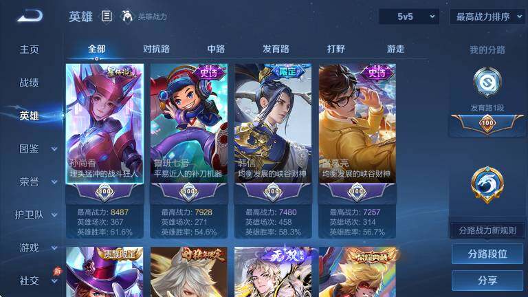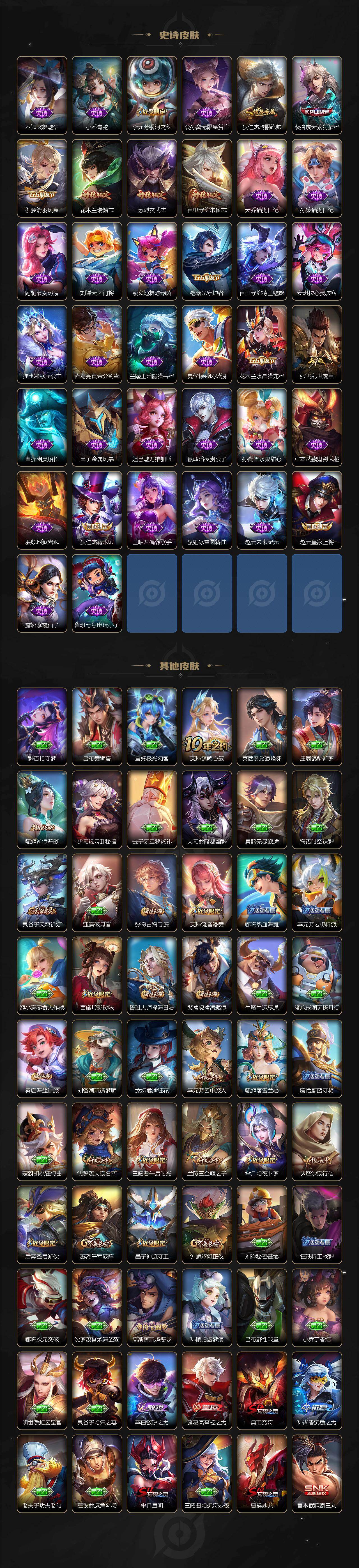 贵族9/皮肤264/典藏3/传说21/史诗79/英雄128/敖隐全皮/全息碎影