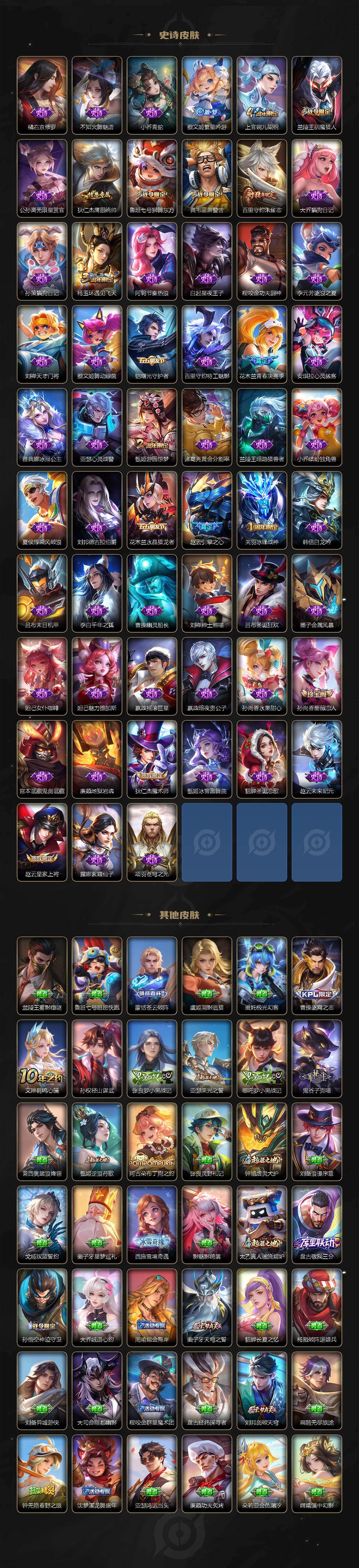 【传说皮肤】:夏侯惇霜北刀,云中君群星魔术团,孙尚香乘龙问璇玑,夏洛特浮生妄,孙悟空齐天大圣,李信山海炽霜斩,吕布怒海麟威,铠绛天战甲,虞姬启明星使,孙悟空零号赤焰,宫本武藏地狱之眼,孙悟空地狱火