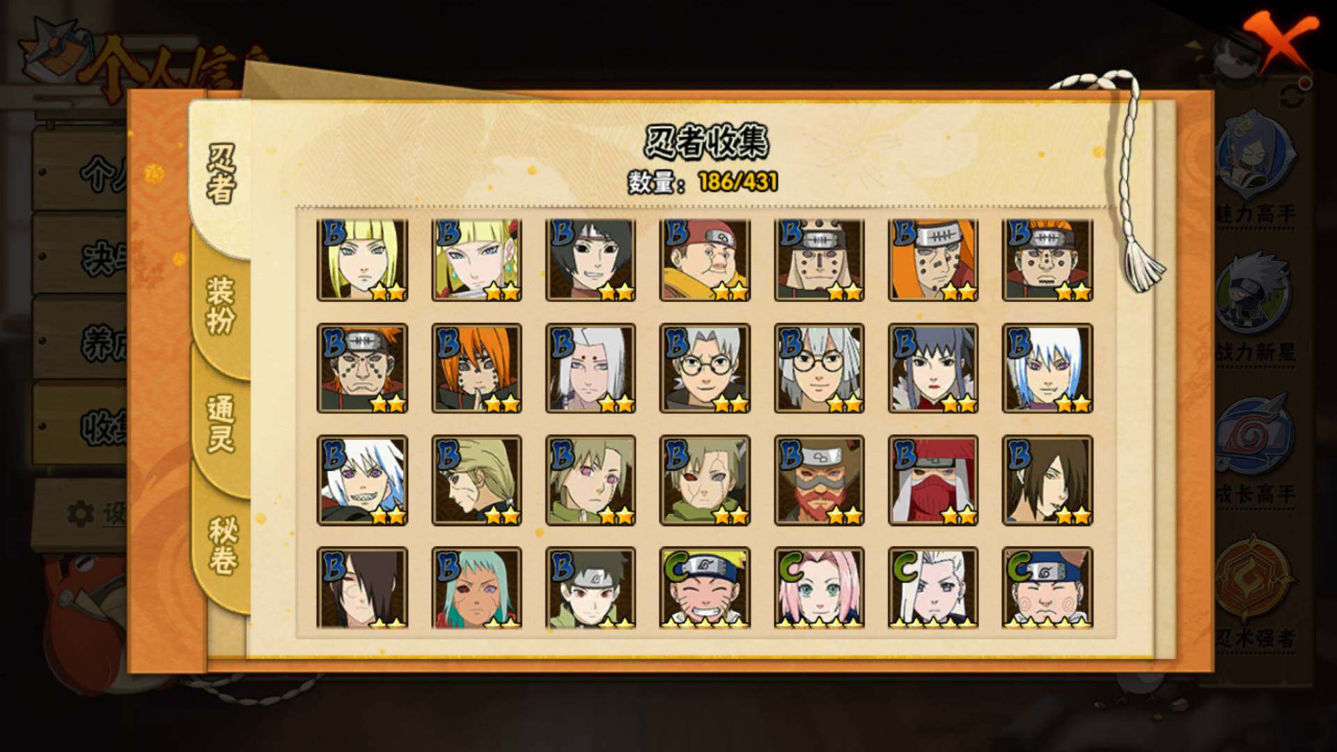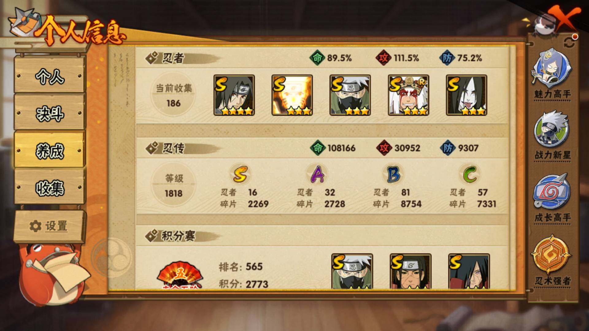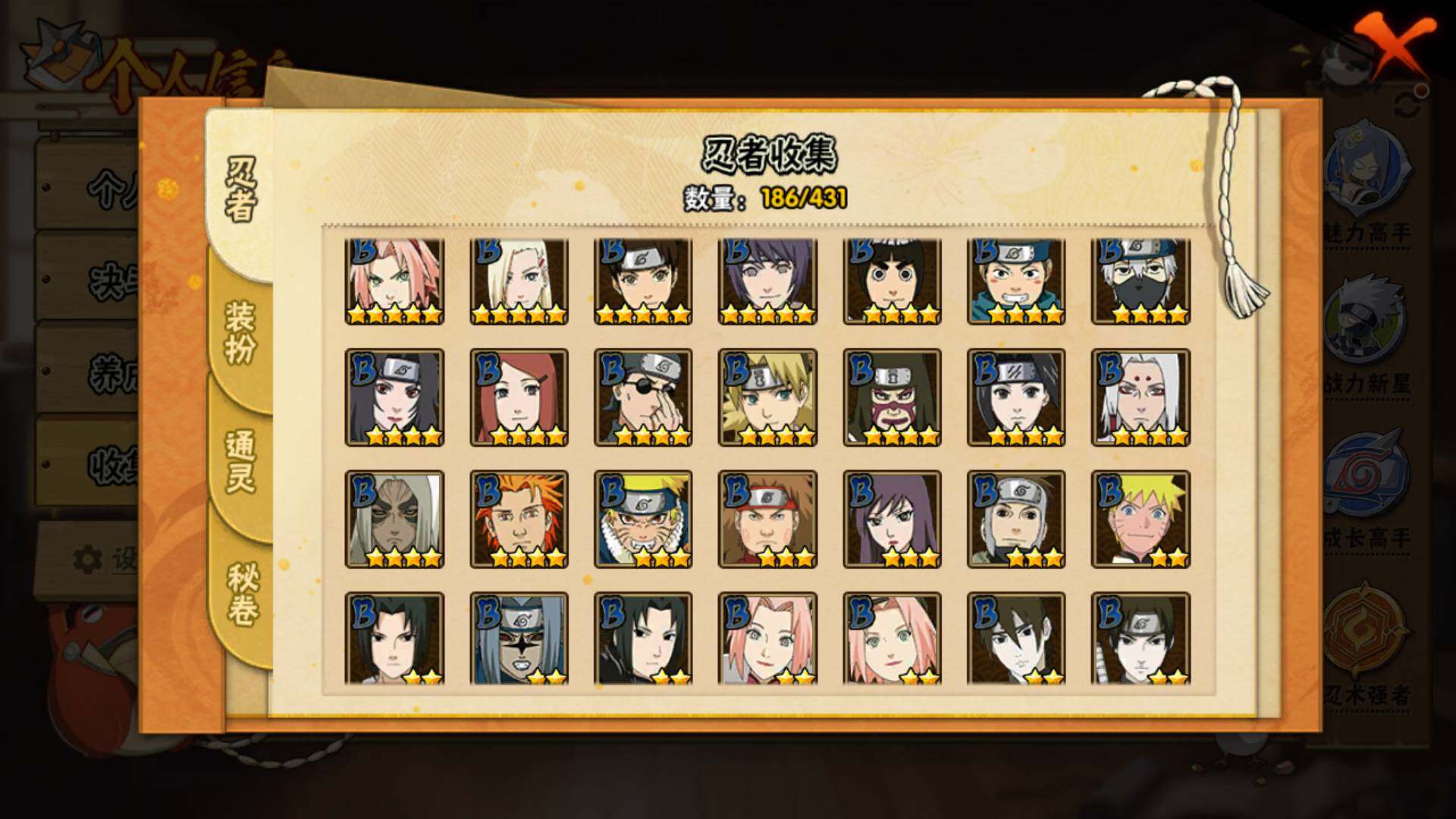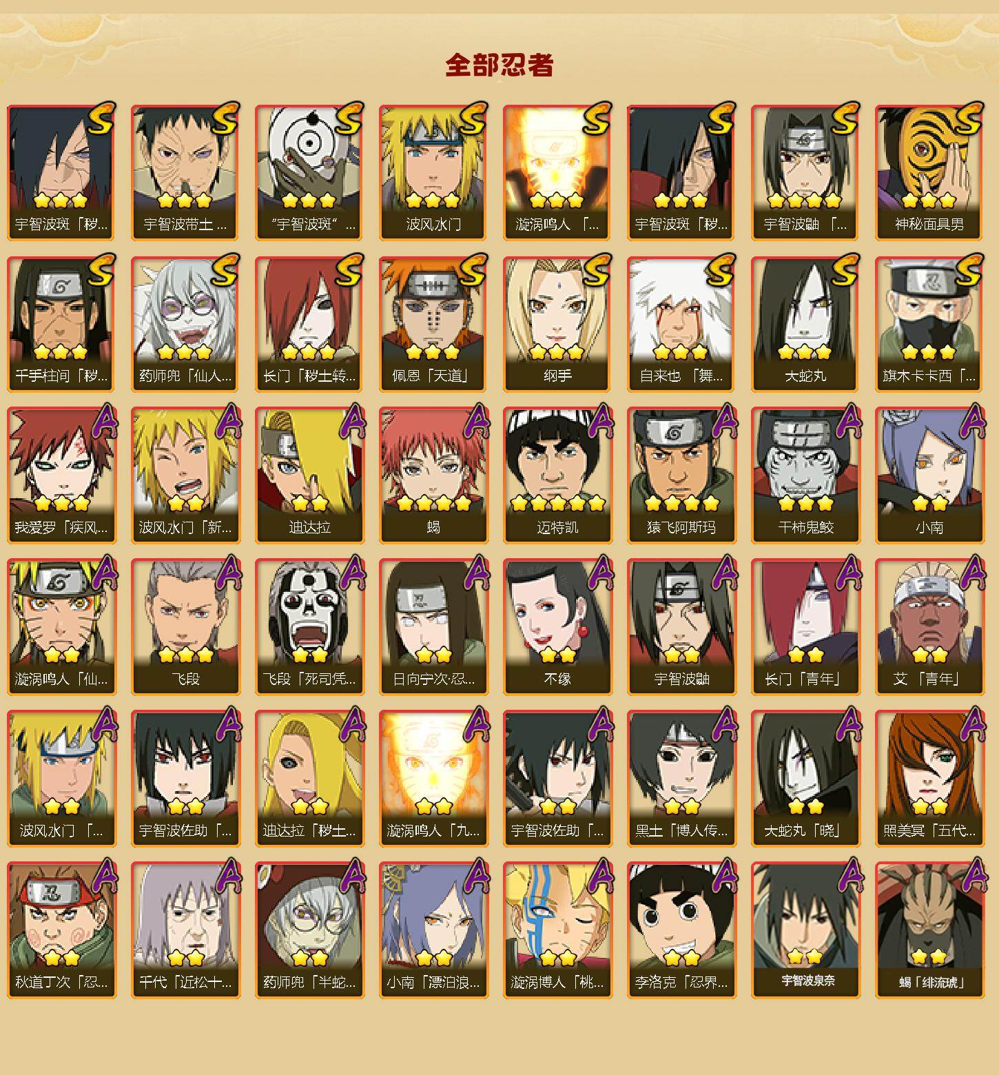 【S级忍者】:长门「秽土转生」(3星),千手柱间「秽土转生」(3星),宇智波斑「秽土转生」(3星),宇智波斑「秽土转生·解」(3星),宇智波带土「忍界大战」(3星),宇智波鼬「须佐能乎」(4星),旗木卡卡西「须佐能乎」(3星),自来也